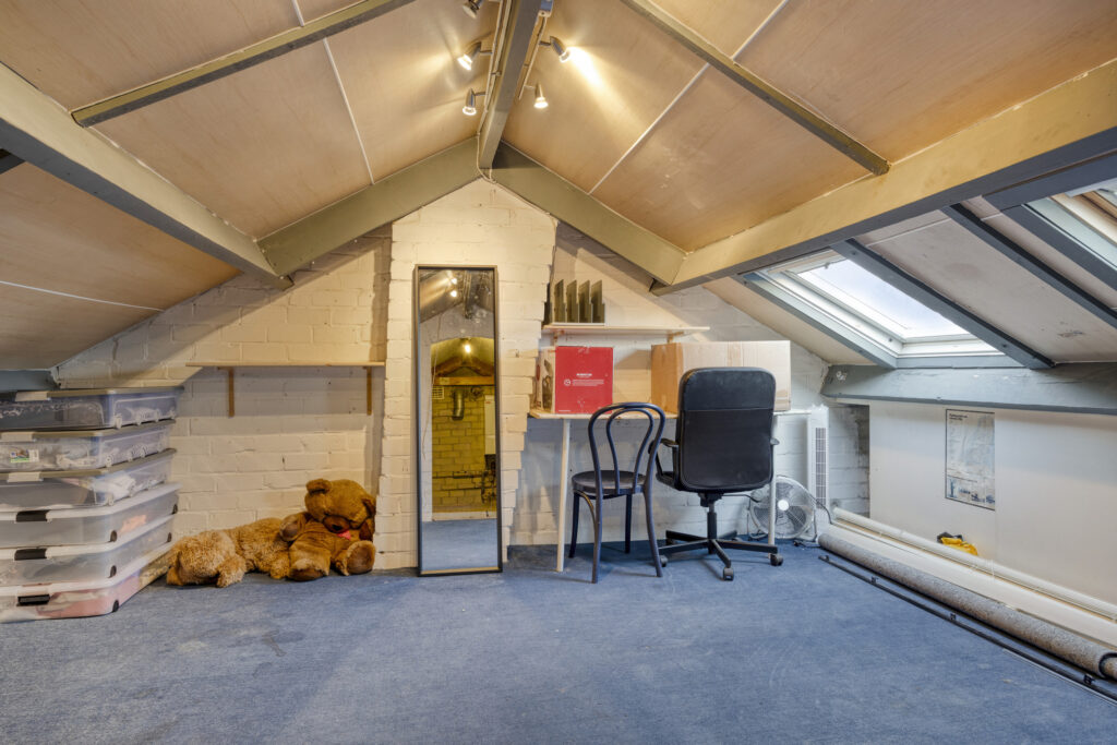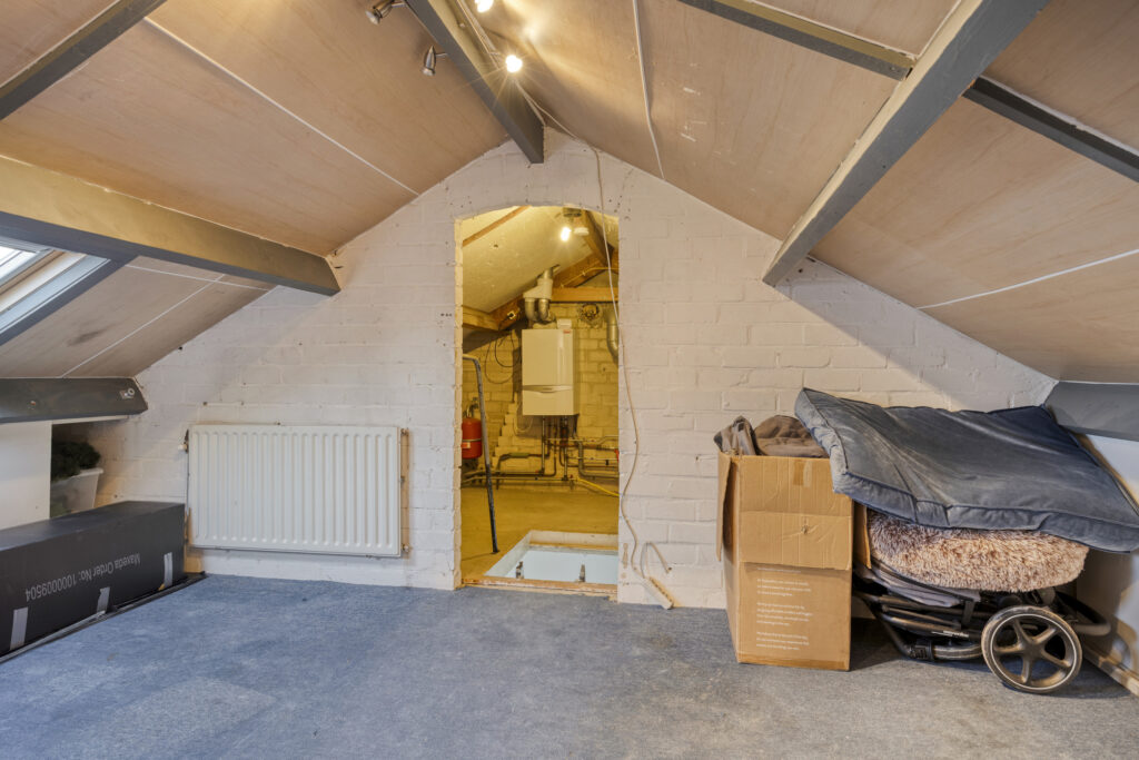 De verwarmde zolderkamer, met 2 Velux dakramen, vloerbedekking en bergruimtes met schuifpanelen onder de kaphelling aan zowel de voor- als achterzijde, biedt de mogelijkheid tot het creëren van een extra logeerkamer of hobby-/werkruimte.