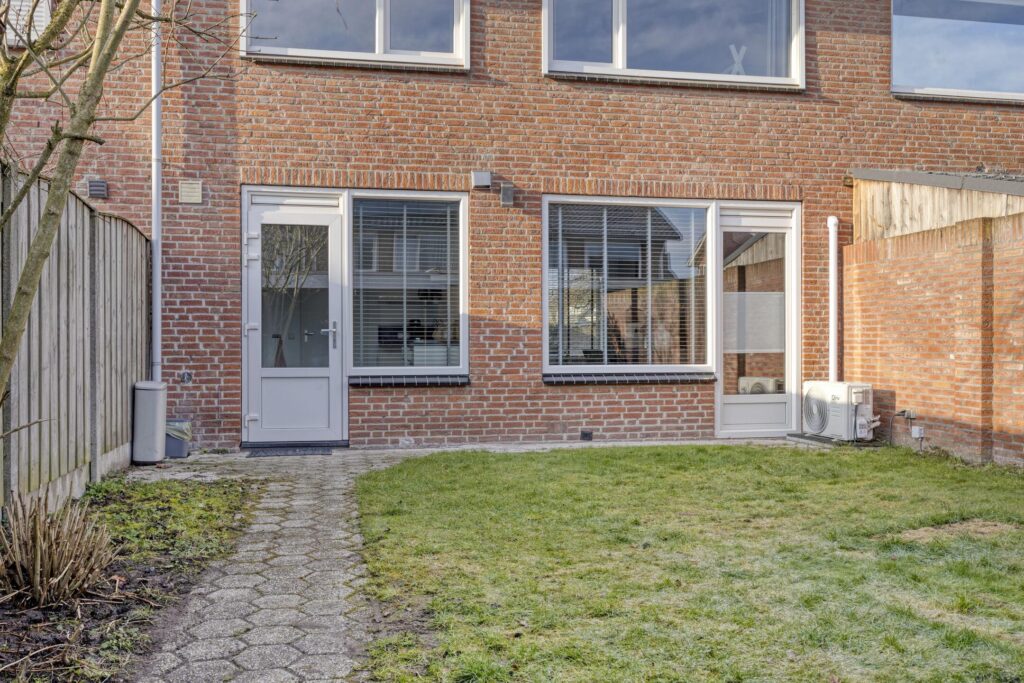 Tegen de achtergevel van de woning bevindt zich een lichtpunt en een buitenkraantje met afvoerputje, alsmede de buitenunit van de airco.