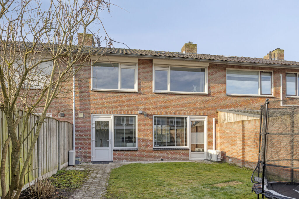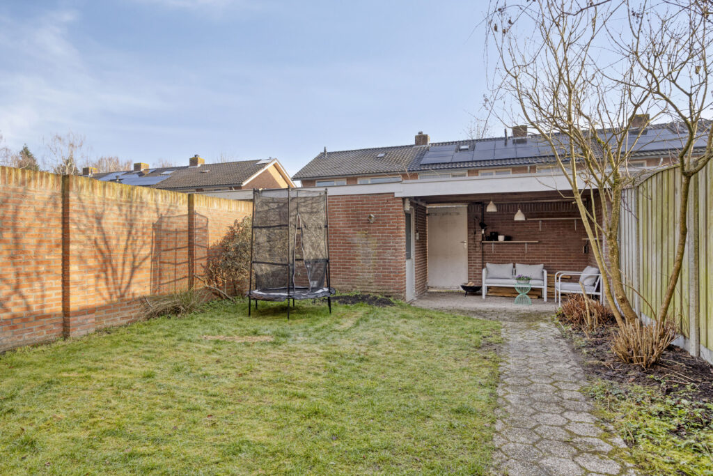 De ca. 11 meter diepe, op het noord-oosten gesitueerde achtertuin is volledig omsloten, met aan de ene zijde een houten en aan de andere zijde een gemetselde schutting en is aangelegd met beton-/grindtegels, een gazon en plantenborder.