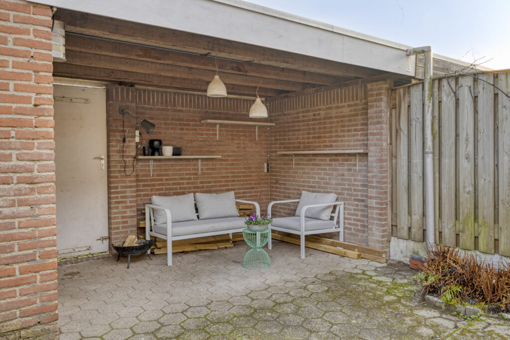 Achterin de tuin bevindt zich een overdekt terras annex loungehoek, met enkele wandplankjes, elektra en een stopcontact, alsmede de afsluitbare poort naar het achtergelegen, niet-doorgaande buurpad.