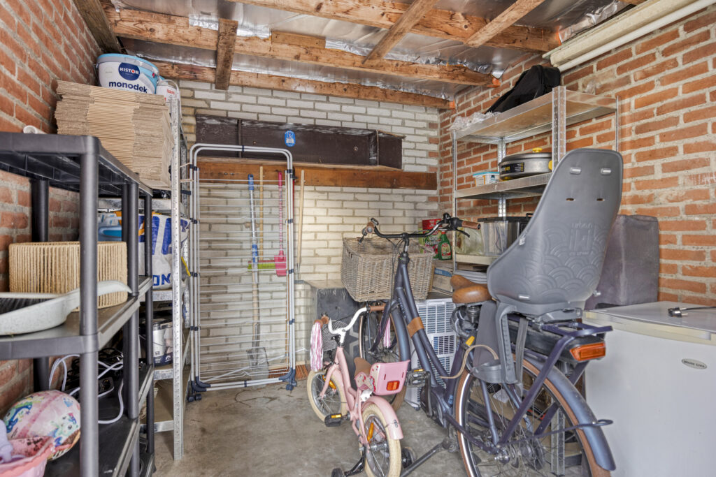 Van onder deze overkapping heeft u vervolgens toegang tot de halfsteens berging (van ± 8 m²) met een betonvloer, houten platdak, elektra en TL-verlichting, welke ideaal is voor bijvoorbeeld opslag, het stallen van fietsen en de mini-containers en/of het gebruik als werk-/hobbyruimte.