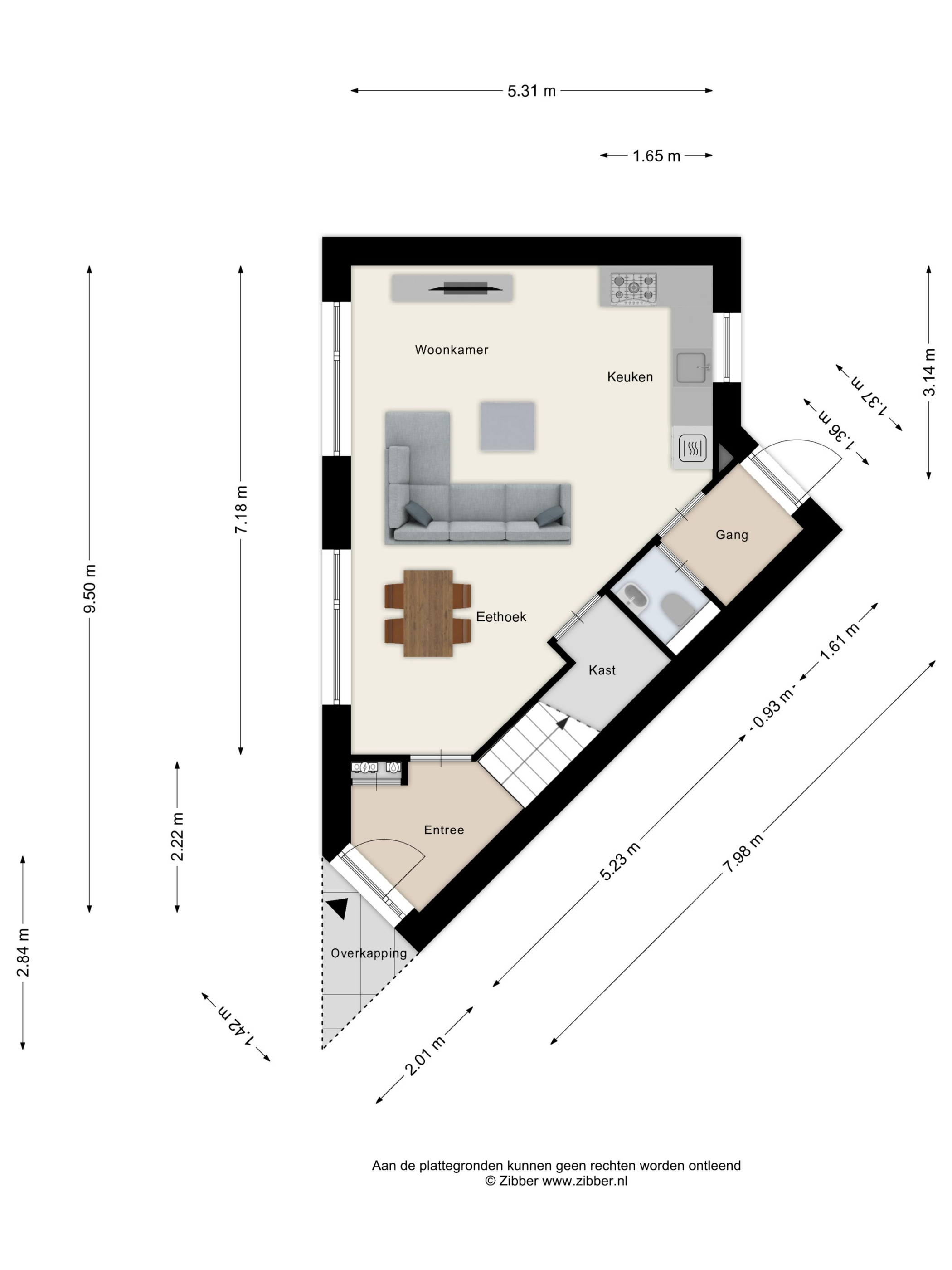 Overdekte entree. Ontvangsthal met meterkast, trapopgang en toegang tot de woonkamer.