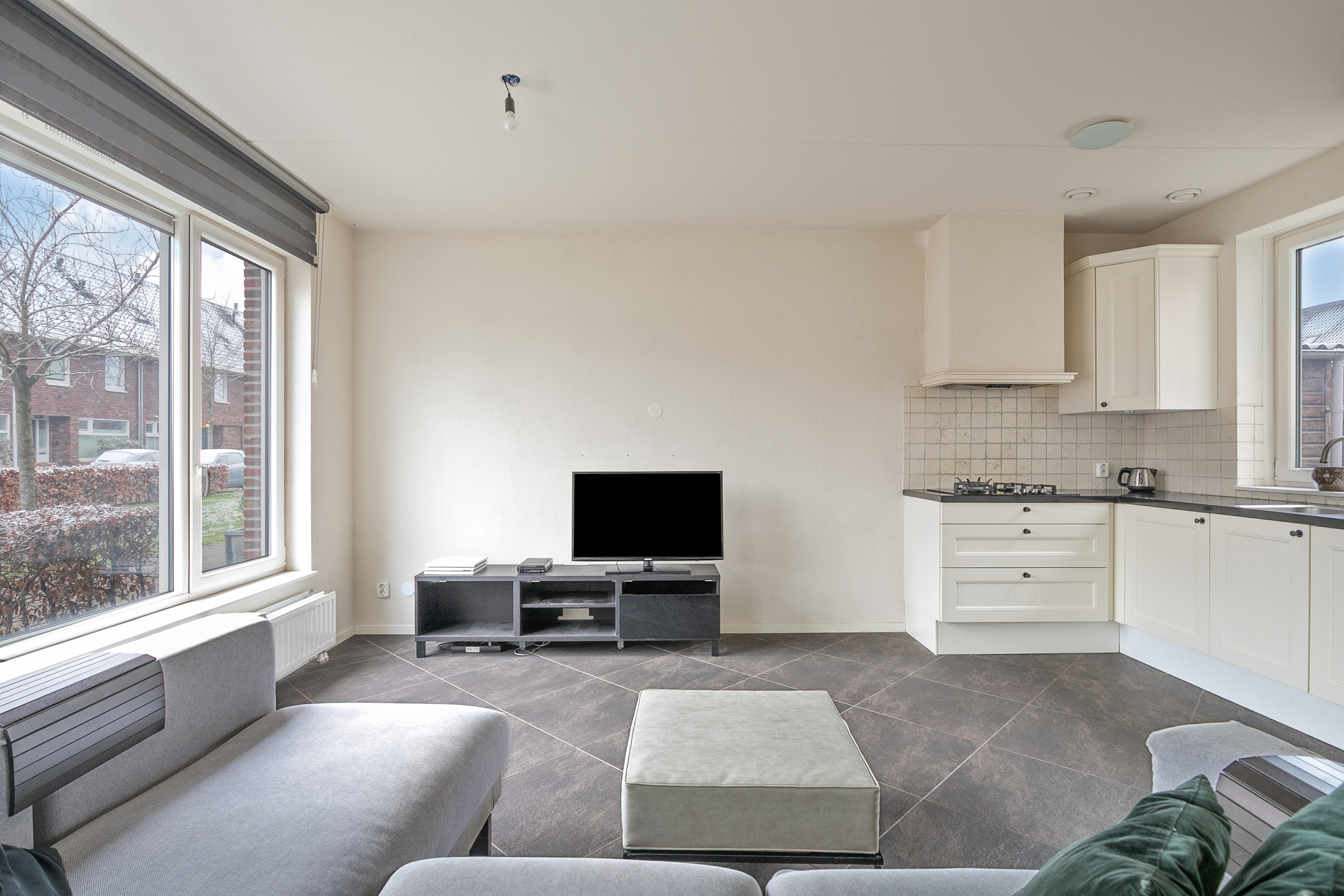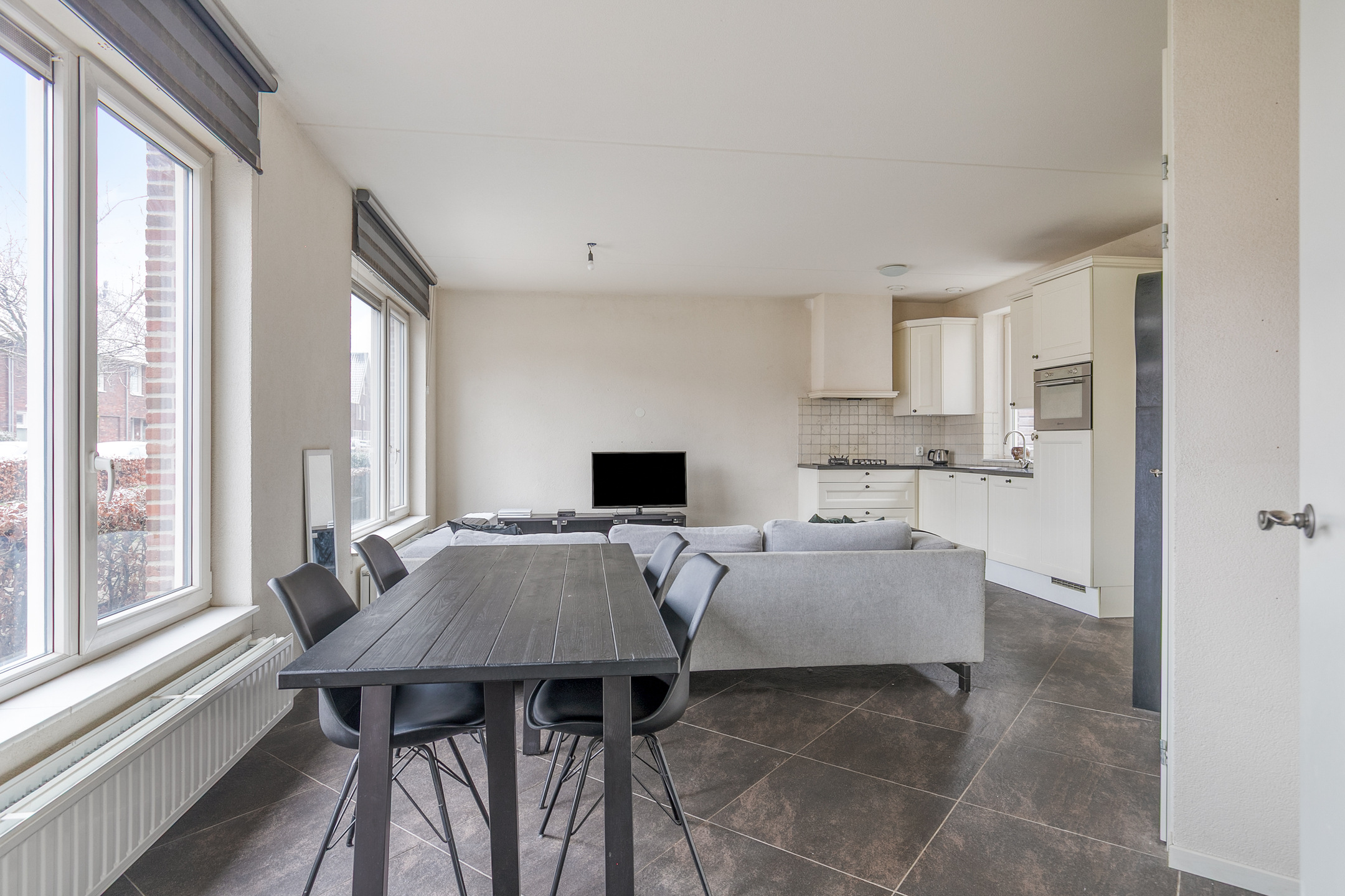 Lichte en sfeervolle woonkamer met prettige daglichttoetreding, een nette tegelvloer en een praktische berg-/provisiekast. Een comfortabele leefruimte met voldoende plaats voor zowel een zit- en eethoek.