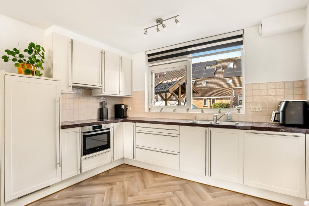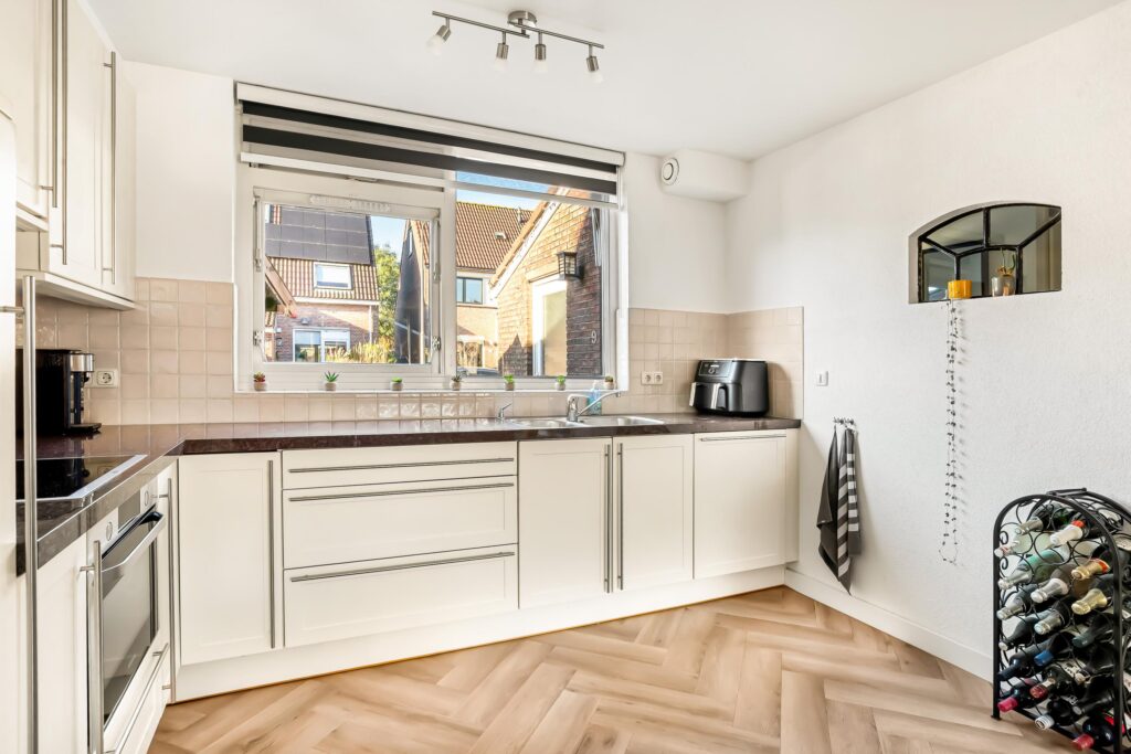 Via de voortuin bereikt u de entree met voorportaal, dat toegang biedt tot zowel de berging als de woning zelf. Vanuit de hal komt u in de lichte en zeer ruime woonkamer, die aan de achterzijde is uitgebouwd. De grote glazen achterpui zorgt voor een heerlijke hoeveelheid daglicht en een prettige verbinding met de tuin. Aan de voorzijde bevindt zich de open keuken, uitgevoerd in een hoekopstelling en voorzien van diverse inbouwapparatuur en een granieten werkblad.