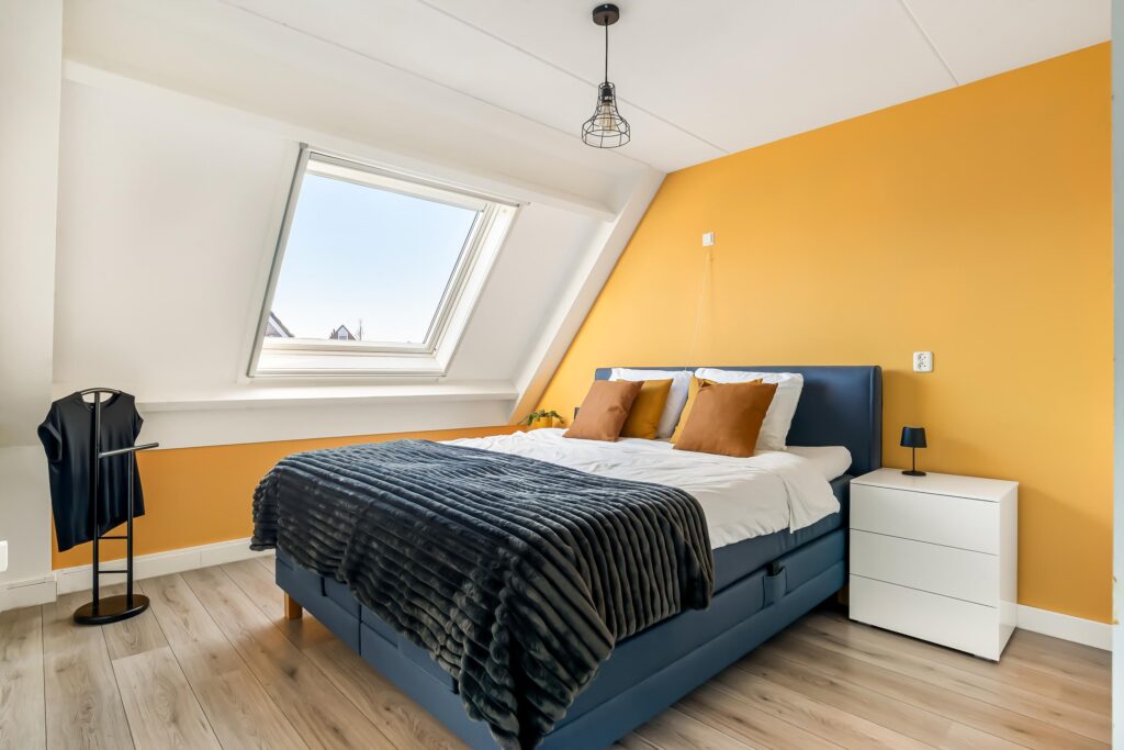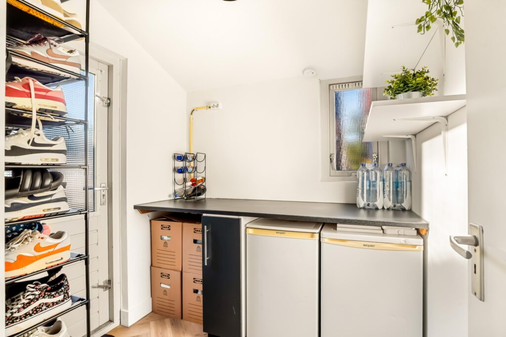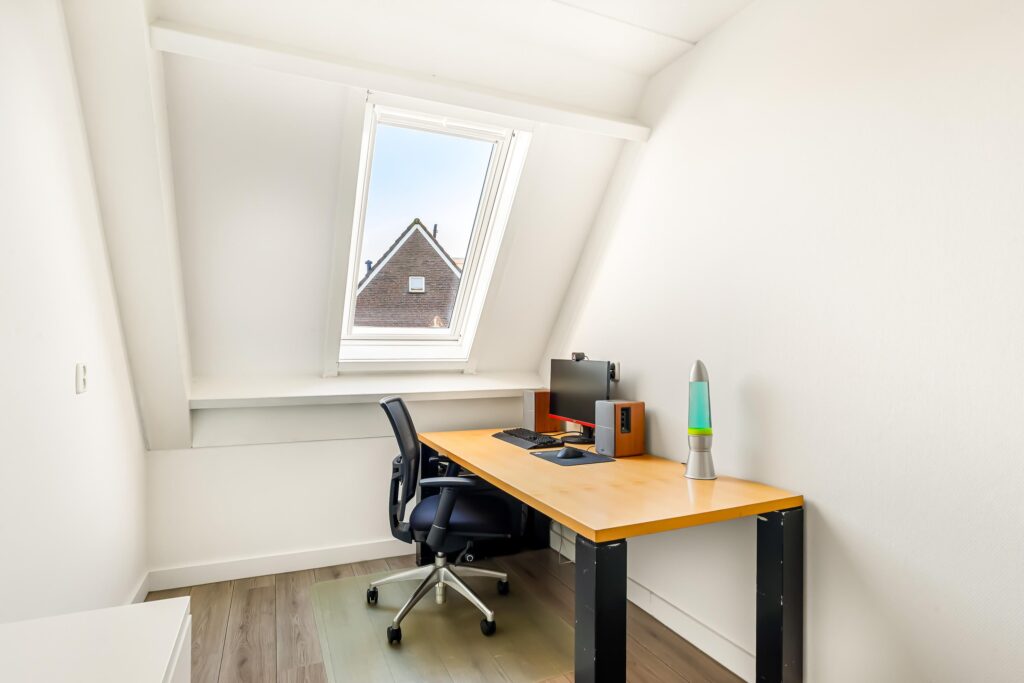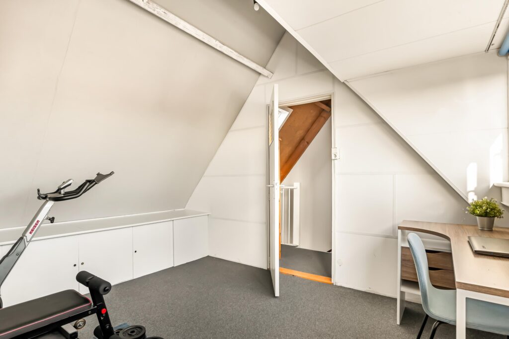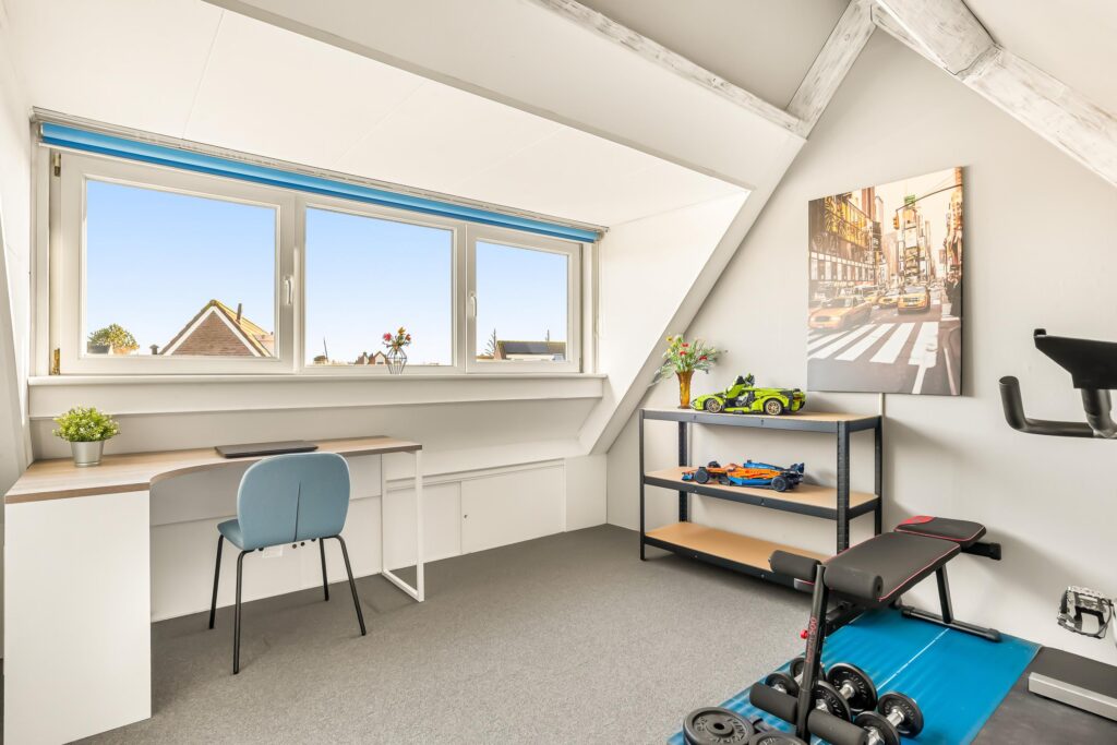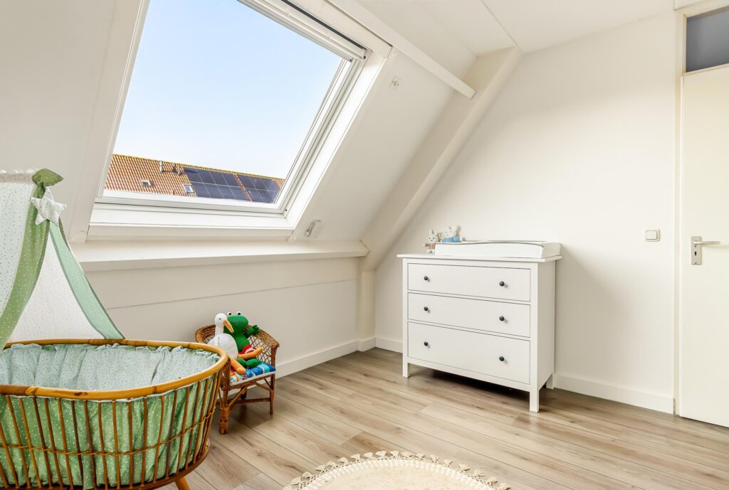 De tweede verdieping biedt een ruime overloop met de opstelling van de cv-ketel, wasmachine en mechanische ventilatie. Daarnaast is hier de vierde slaapkamer gerealiseerd, voorzien van een dakkapel aan de achterzijde, wat zorgt voor extra ruimte en licht. De knieschotten over de gehele breedte van de slaapkamer bieden aan beide zijden extra bergruimte.