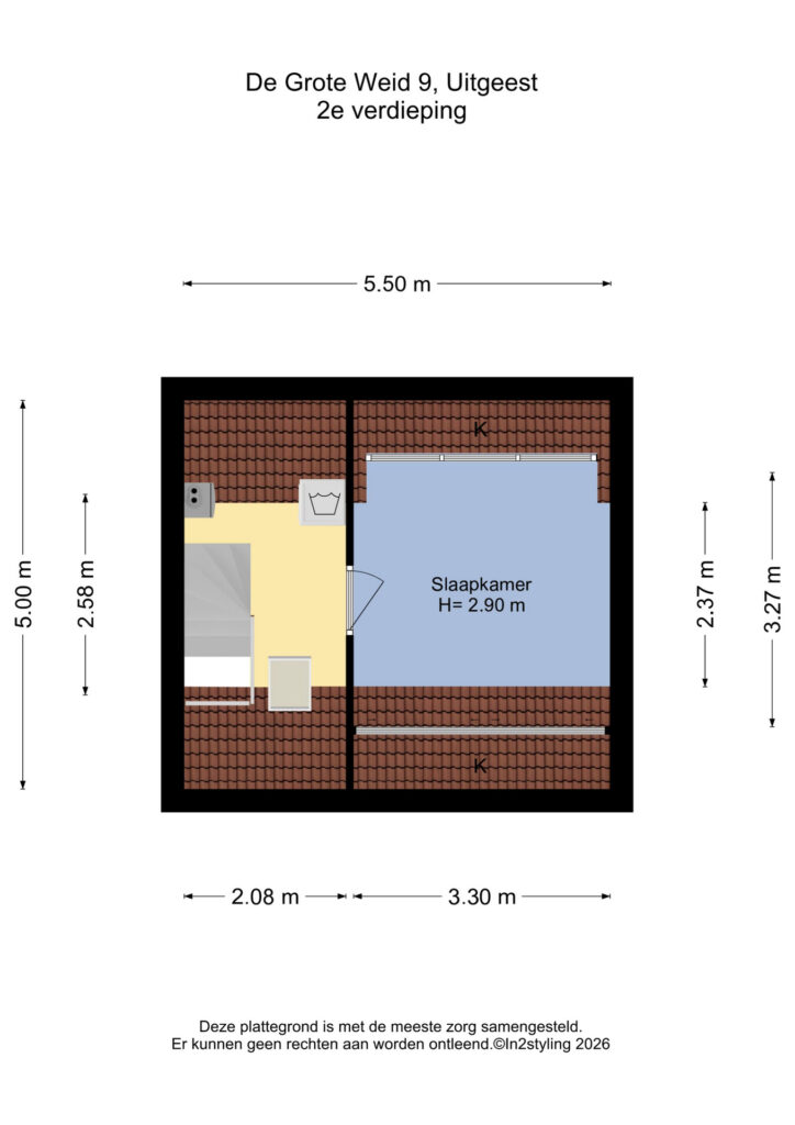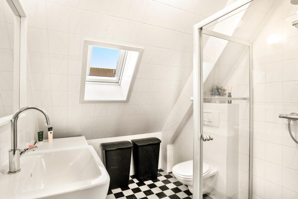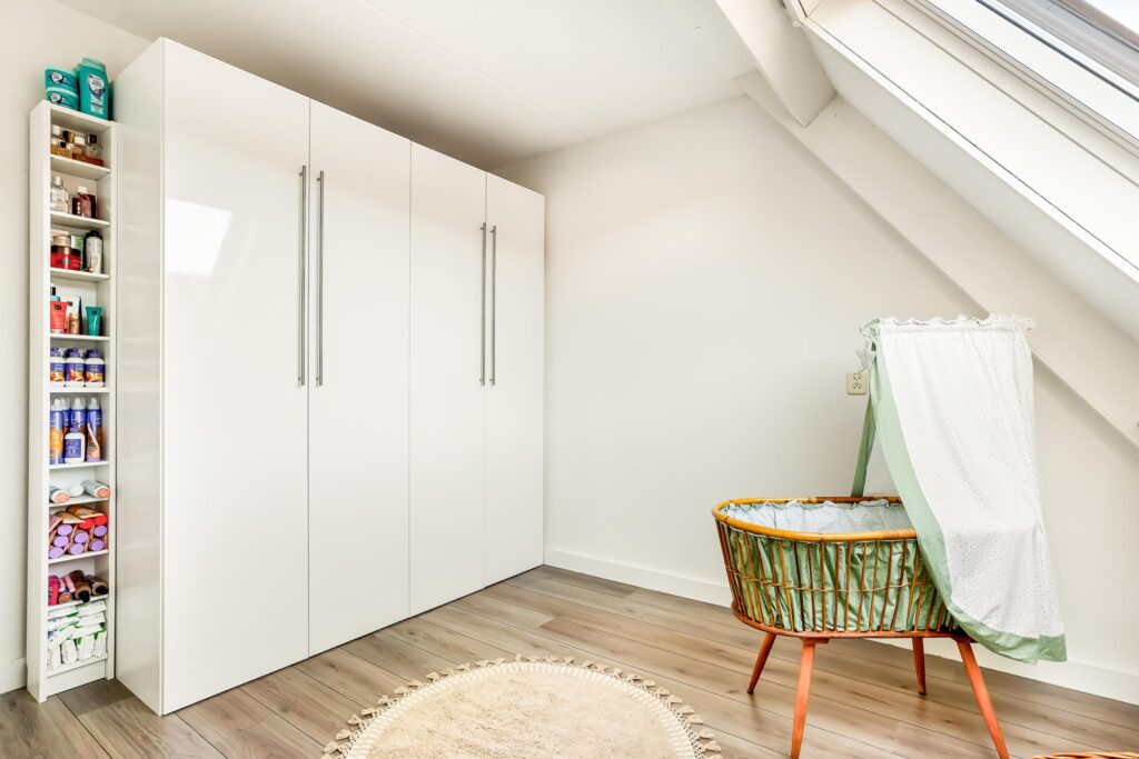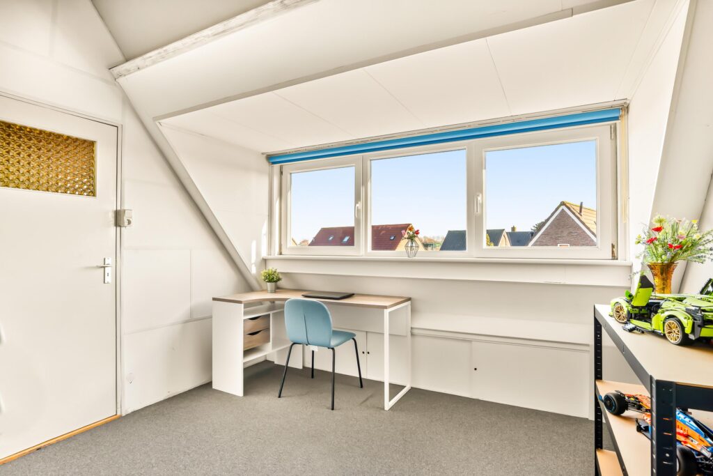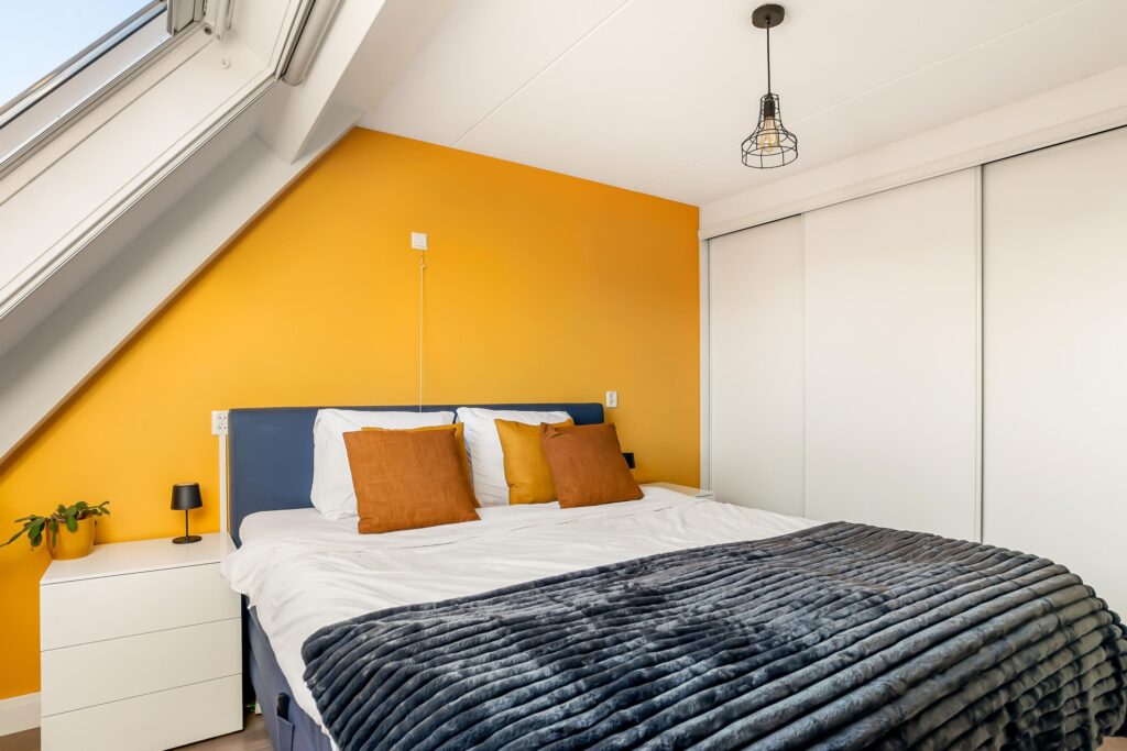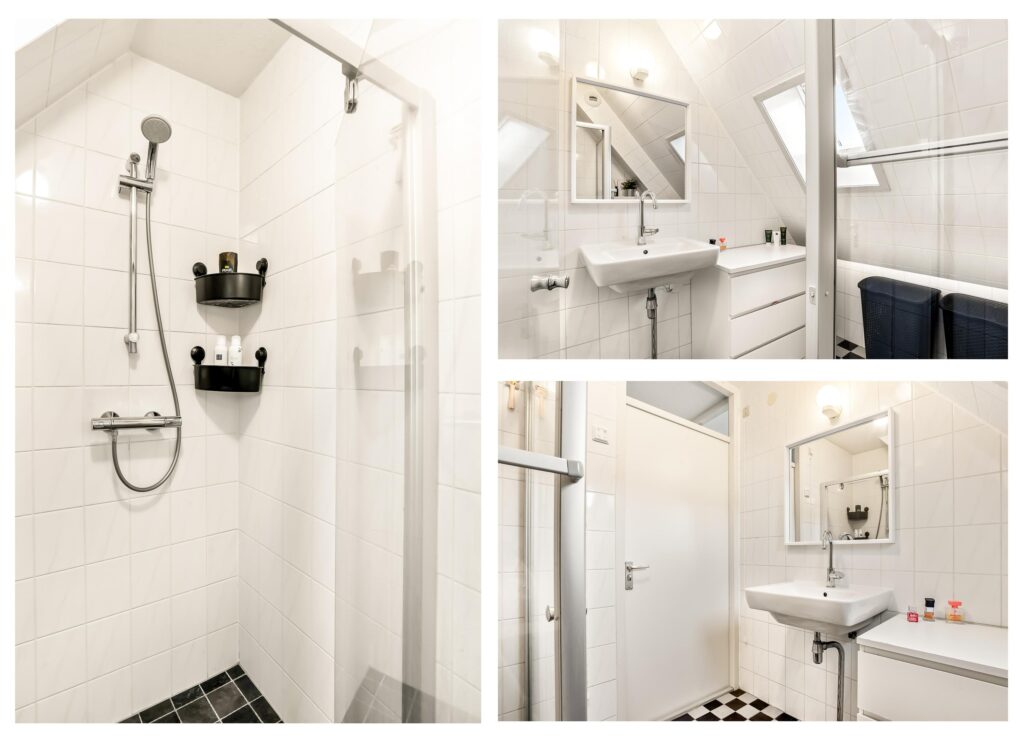 De tweede verdieping biedt een ruime overloop met de opstelling van de cv-ketel, wasmachine en mechanische ventilatie. Daarnaast is hier de vierde slaapkamer gerealiseerd, voorzien van een dakkapel aan de achterzijde, wat zorgt voor extra ruimte en licht. De knieschotten over de gehele breedte van de slaapkamer bieden aan beide zijden extra bergruimte.