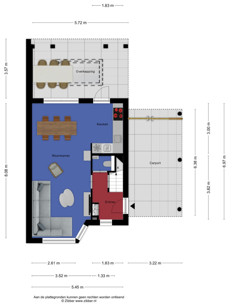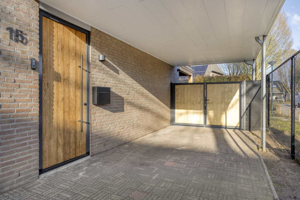 Via de voortuin en oprit met carport is de entree bereikbaar. De fraaie met hout beklede voordeur geeft direct een gevoel van luxe en degelijkheid bij binnenkomst van de woning.