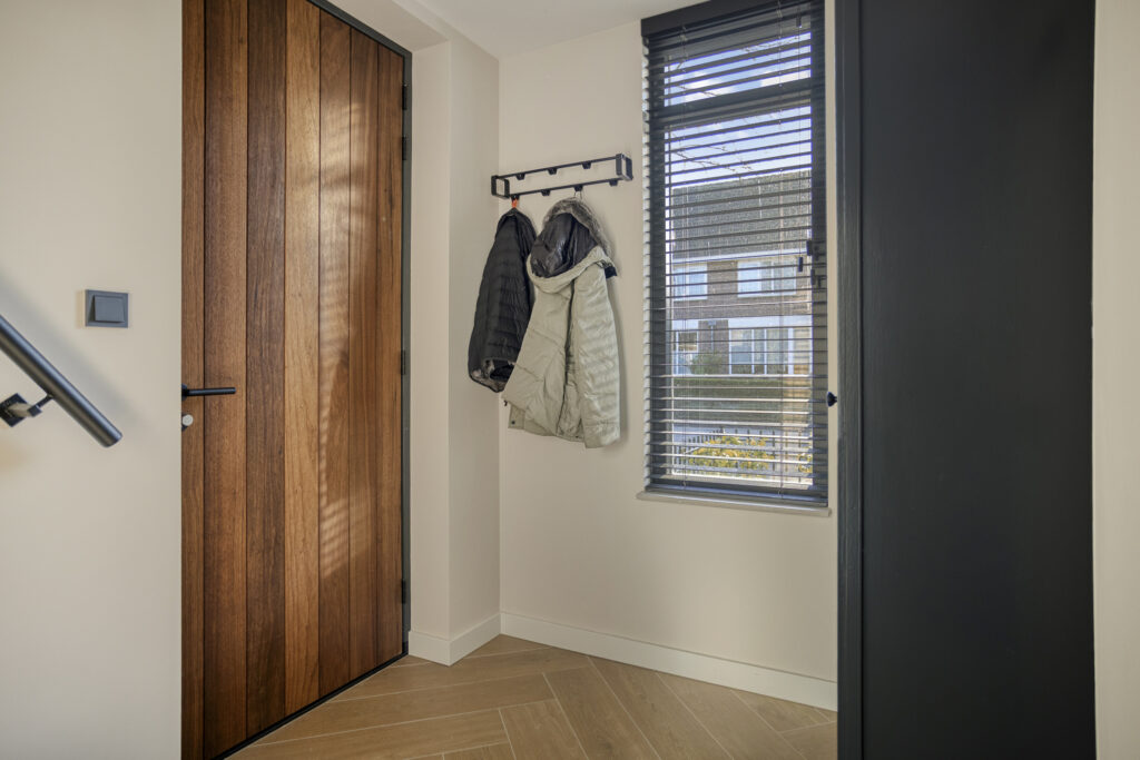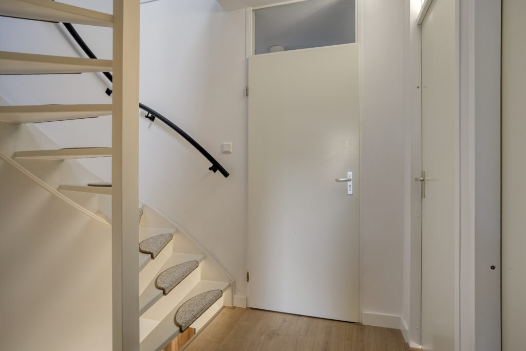 De hal is geheel vernieuwd en voorzien van een visgraat tegelvloer met vloerverwarming, gestuukte wand- en plafondafwerking, trapkast en een moderne toiletruimte.