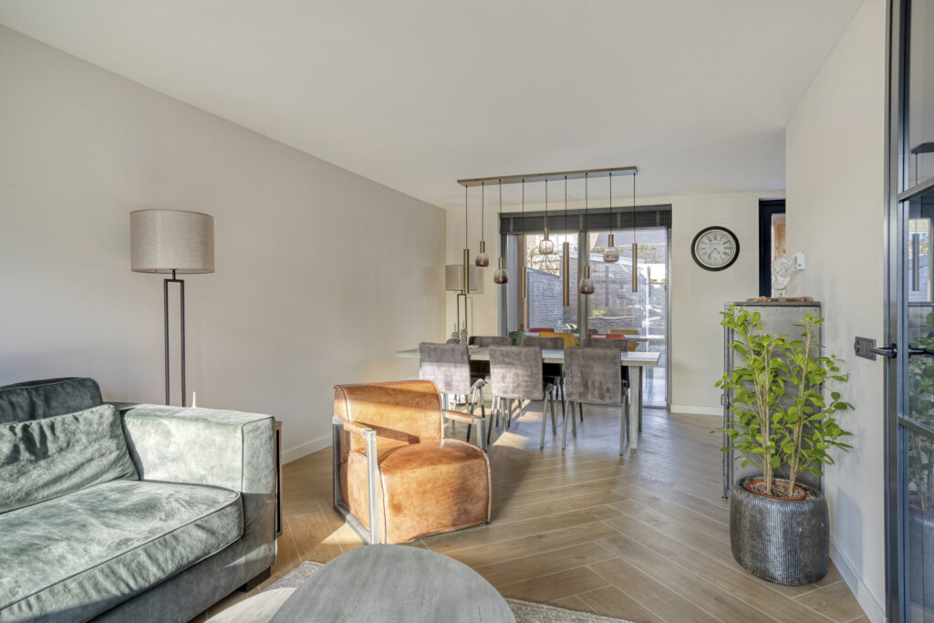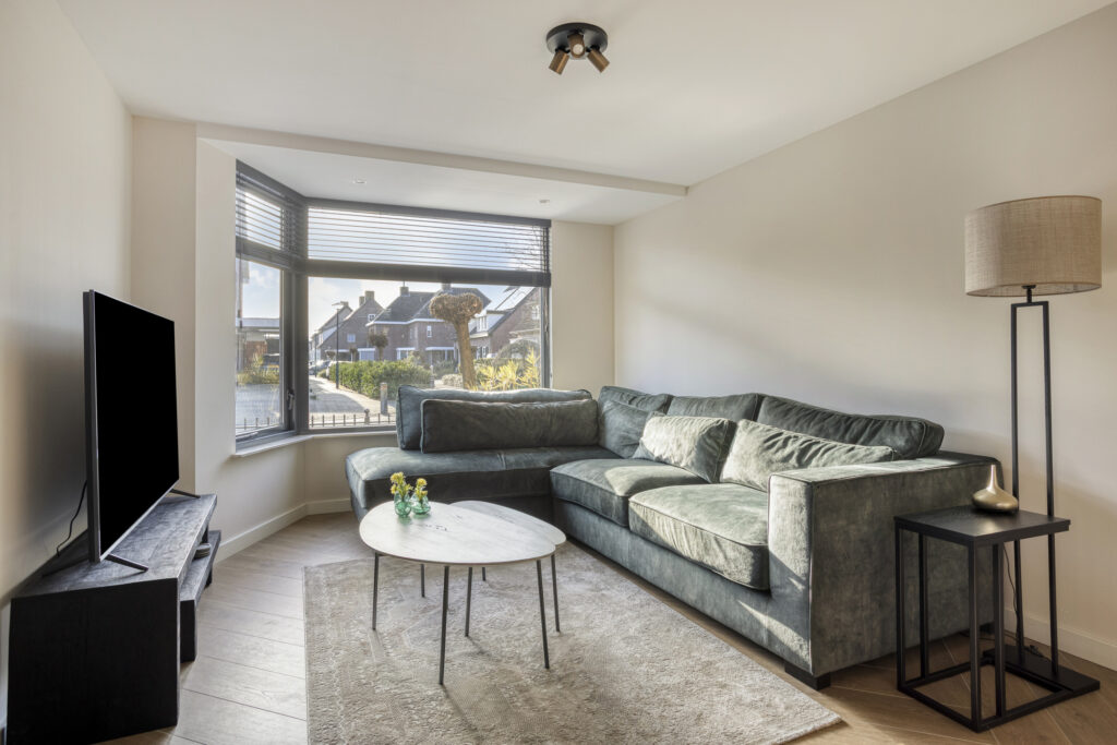 De lichte woonkamer is voorzien van een visgraat tegelvloer met vloerverwarming, gestuukte wanden en plafond en een erker aan de voorzijde waardoor er veel natuurlijke lichtinval is in de woning.
