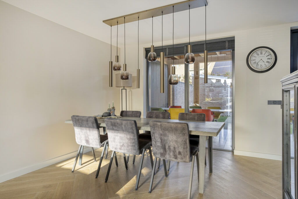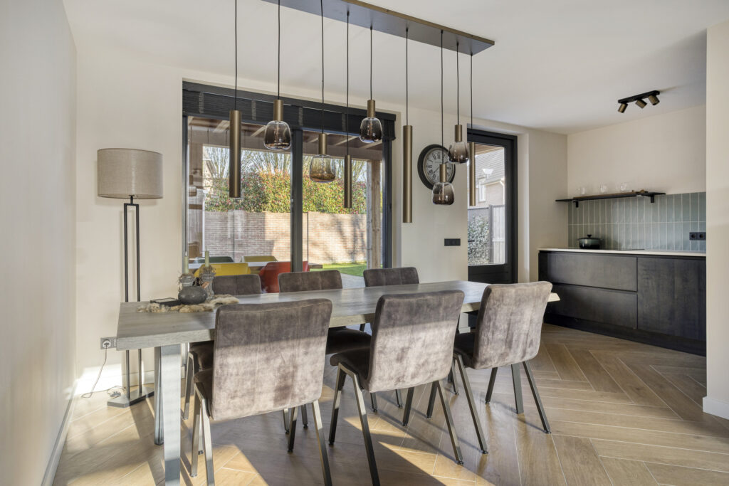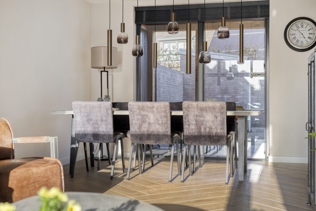 De eethoek is gelegen aan de achterzijde van de woning en heeft zicht op de keuken en middels de hoge raampartij een mooi zicht op de achtertuin.