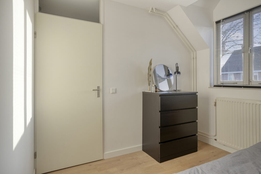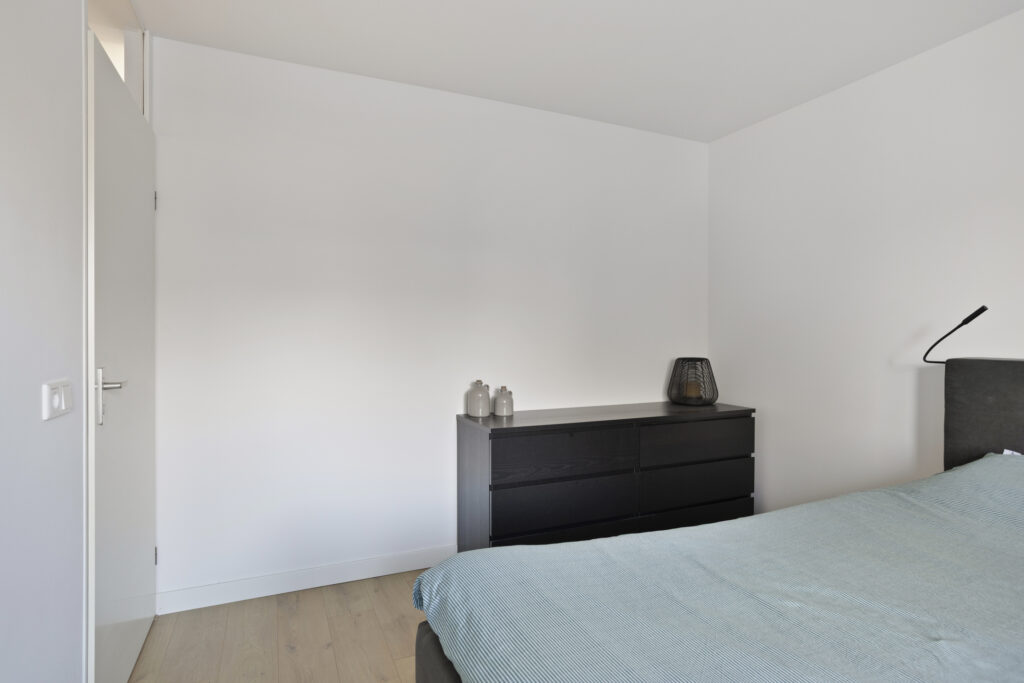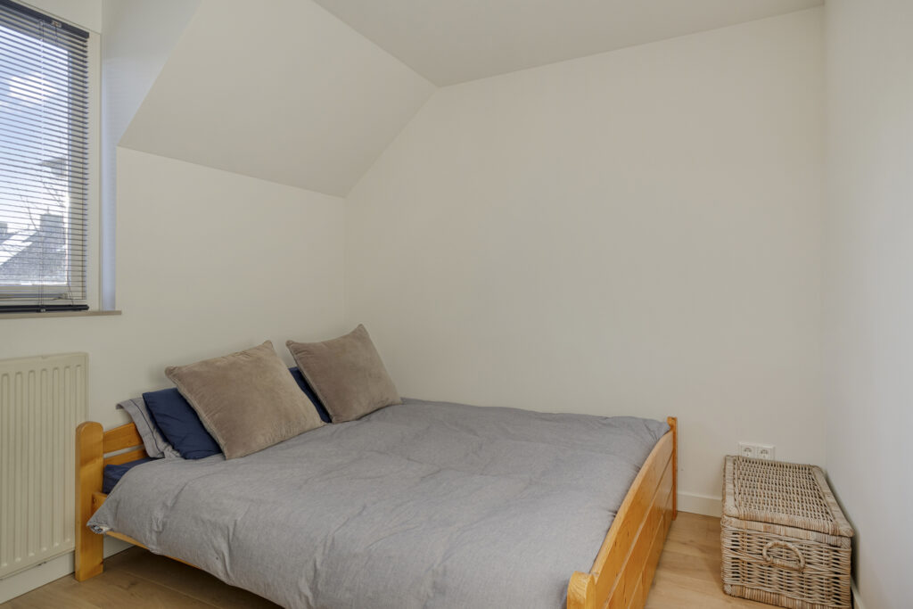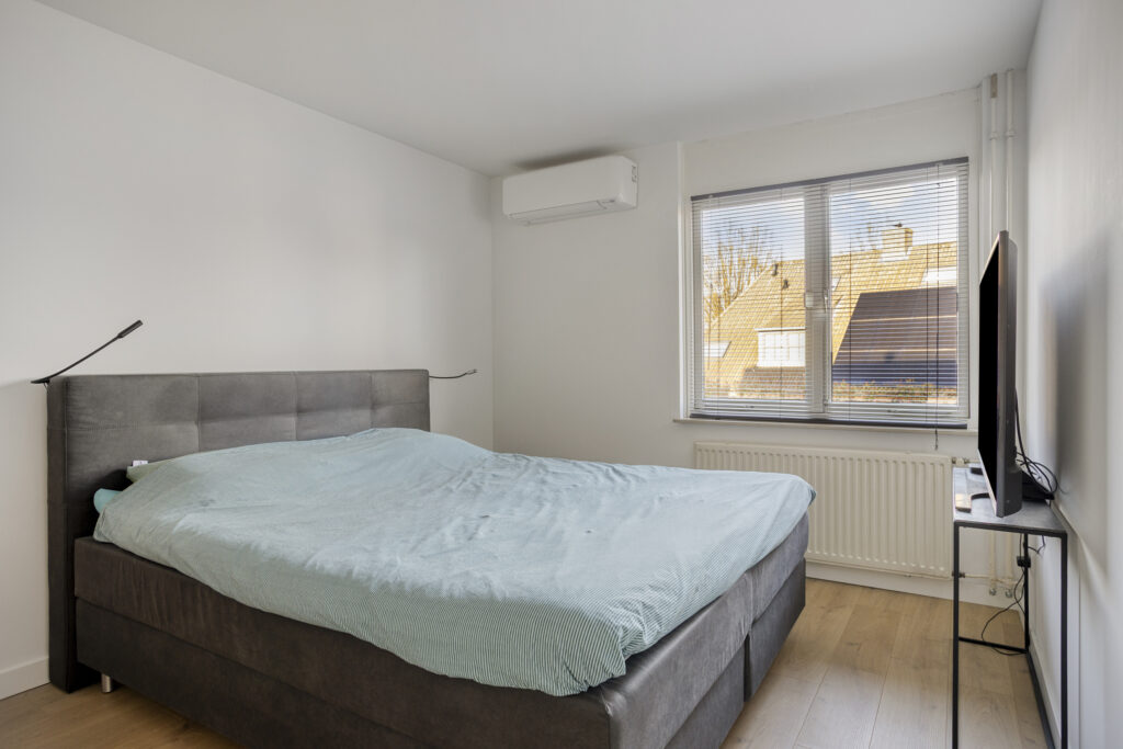 De ouderslaapkamer is gelegen aan de achterzijde van de woning. Deze kamer is voorzien van een laminaatvloer met witte plinten, gestuukte wand- en plafondafwerking, een elektrisch rolluik en een airco-unit als extra comfort.
