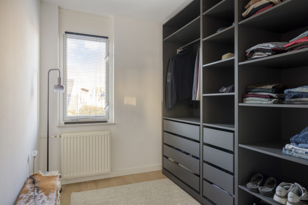 Slaapkamer 3 (nu in gebruik als kastenkamer) kan uitstekend dienst doen als 3e slaapkamer op de verdieping en beschikt over een laminaatvloer en elektrisch rolluik.