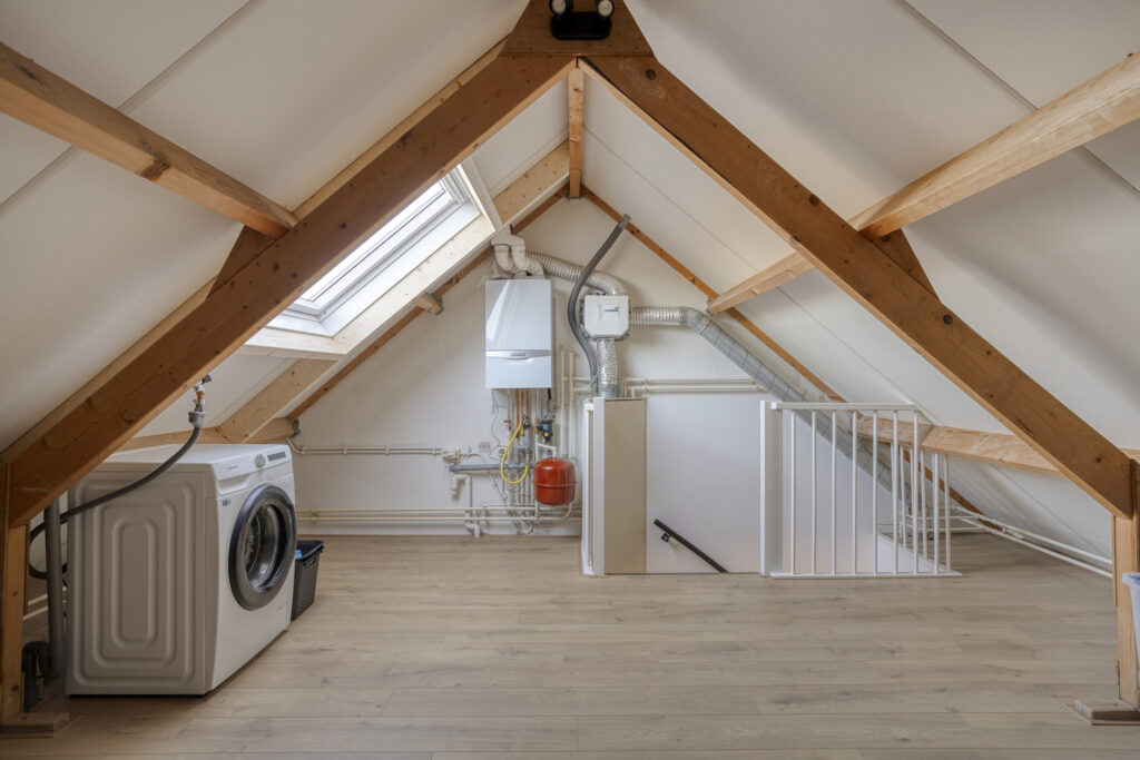 Middels een vaste trap vanuit de overloop is de zolder bereikbaar. Deze ruime zolder voorzien van een groot dakraam kan uitstekend gebruikt worden als 4e slaapkamer.