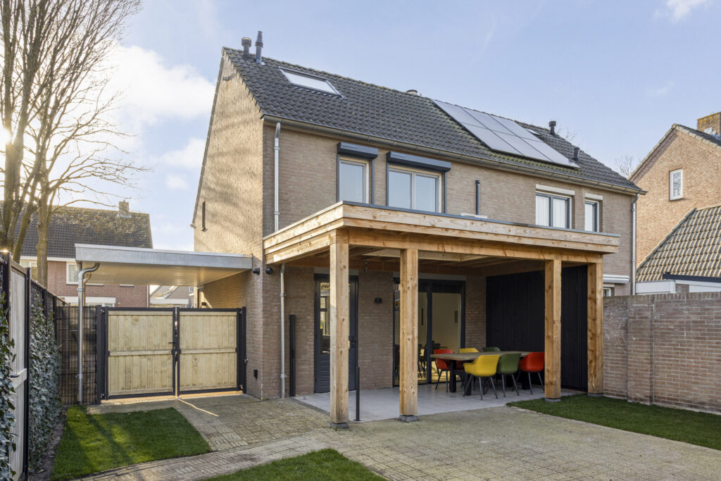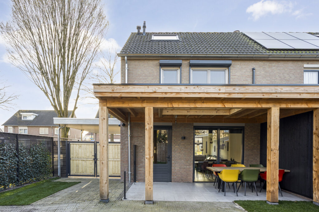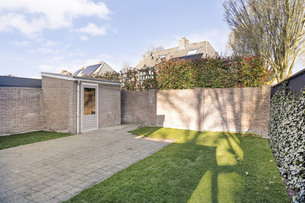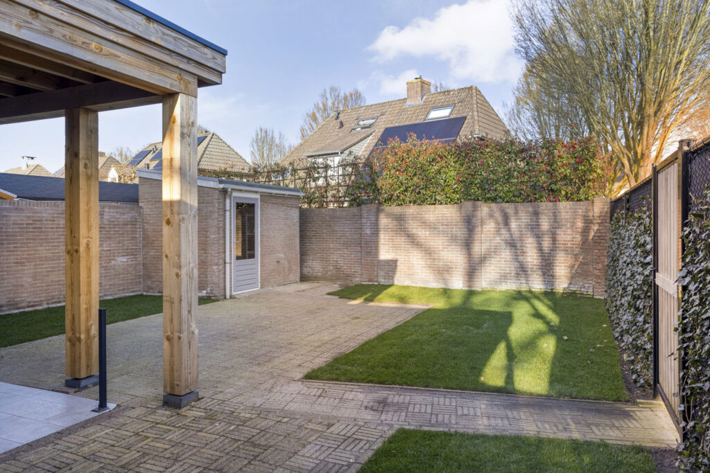 De keurige achtertuin is prettig gelegen ten opzichte van de zon en biedt een goede privacy. De tuin is aangelegd met een fraai overdekt terras met lichtstraat en verlichting, gazon, achterom en toegang tot de carport middels een nieuwe poort. Ook de poort naar de achterom is vernieuwd in 2025.