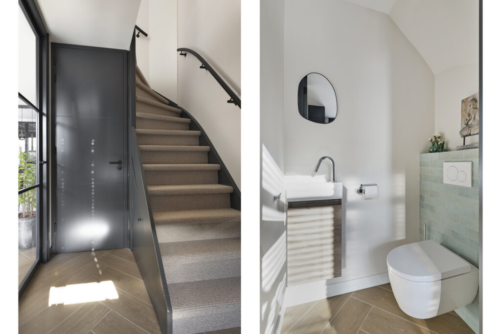 De deels betegelde toiletruimte is luxe uitgevoerd en voorzien van een wandcloset, fonteintje met meubel. Het geheel is hoogwaardig afgewerkt in lichte tinten.