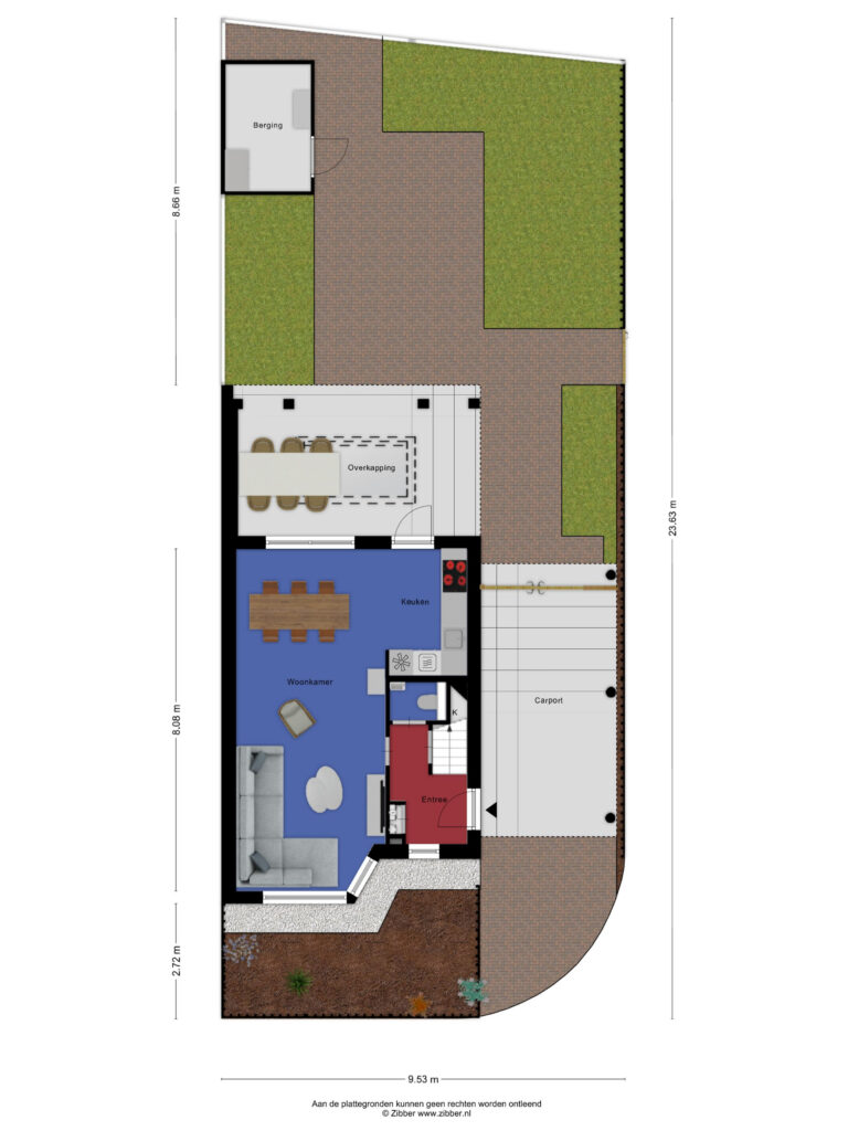– Ruime en zonnige achtertuin met achterom en carport;