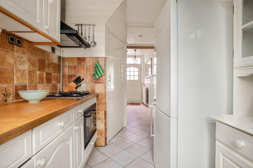 De keuken is praktisch opgesteld in een rechte opstelling en voorzien van diverse inbouwapparatuur.