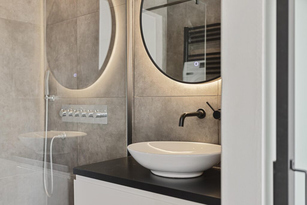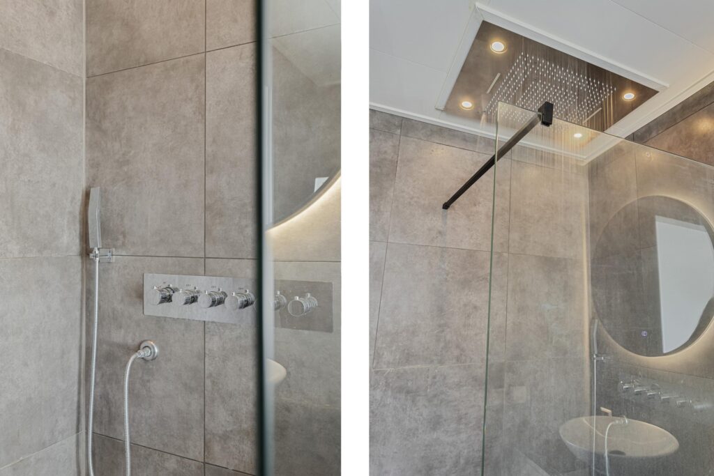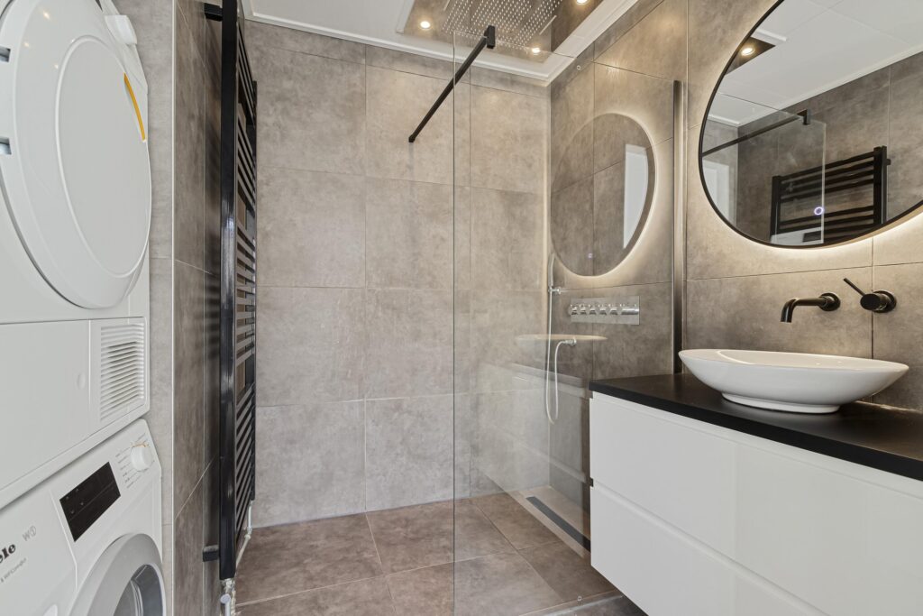 Zeer moderne badkamer (ca. 5m²) met (elektrische) vloerverwarming en voorzien van een fraaie (inloop) regen-douche (geïntegreerd in het plafond) met inbouwkranen en losse handdouche, designradiator, wastafel met meubel en de aansluitingen ten behoeve van de wasapparatuur.