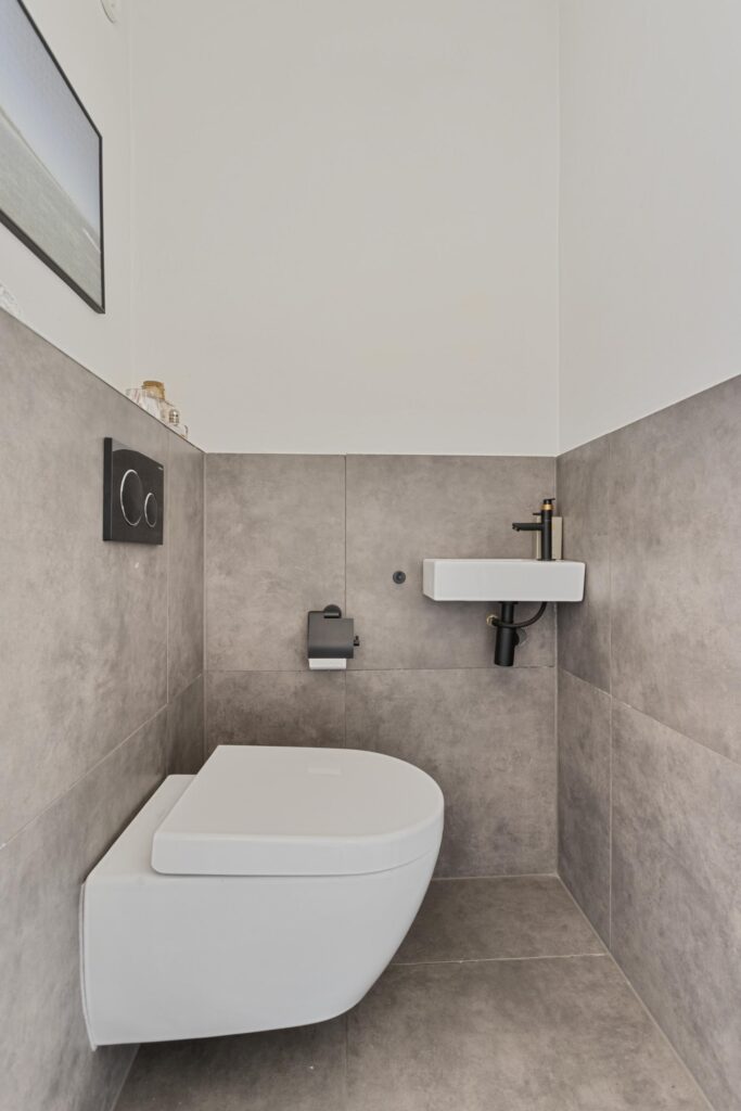Gedeeltelijk betegelde toiletruimte met wandcloset en fonteintje.