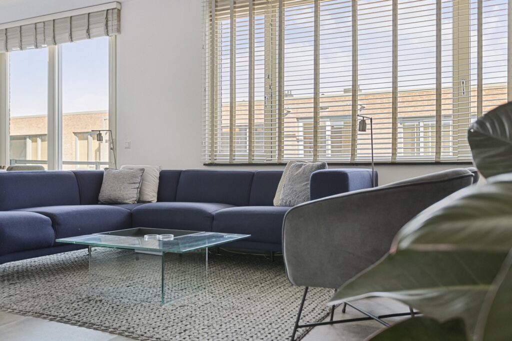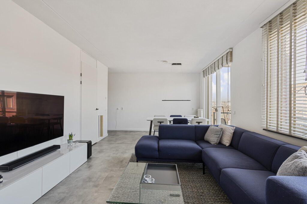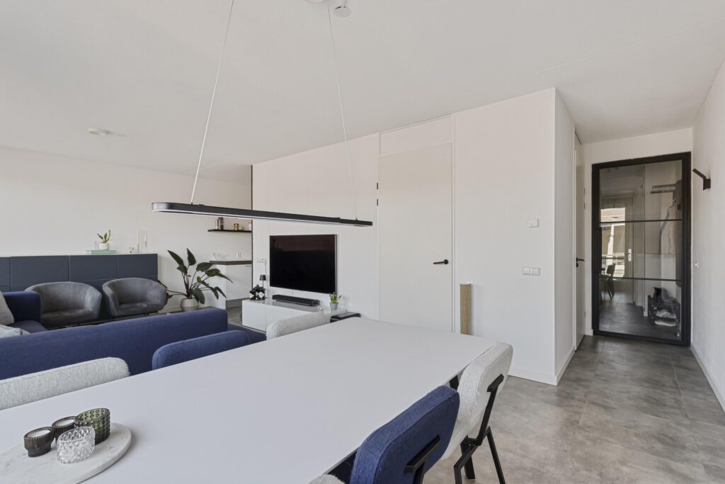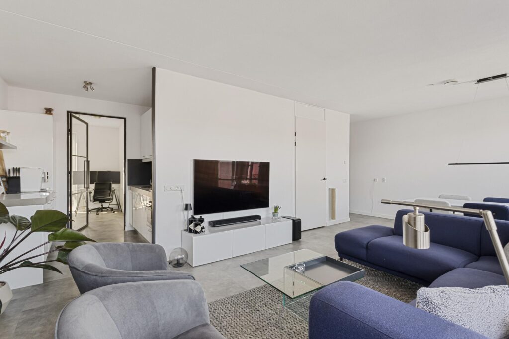 Sfeervolle, lichte woonkamer (ca. 6.00/3.84 x 7.44m.) voorzien van strakke wandafwerking, pvc-vloer en veel lichtinval middels de vele kozijnen. Vanuit de woonkamer is toegang tot het zonnige balkon middels een schuifpui, toegang tot de bergkast met CV-ruimte, WTW-installatie en voldoende bergruimte én is de keuken eveneens bereikbaar.