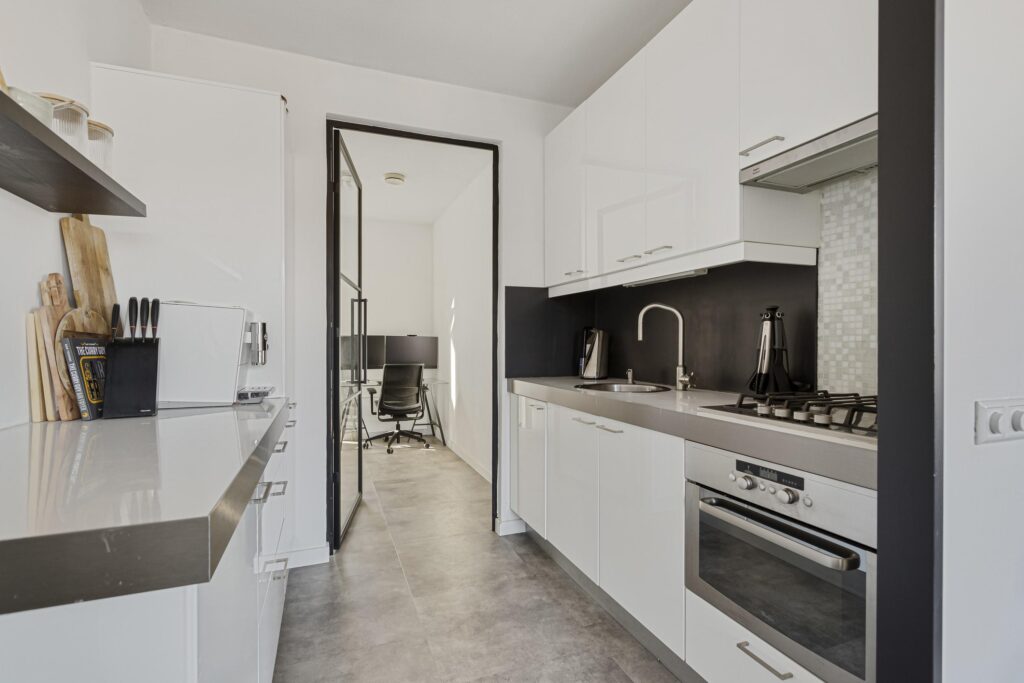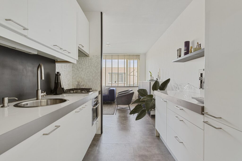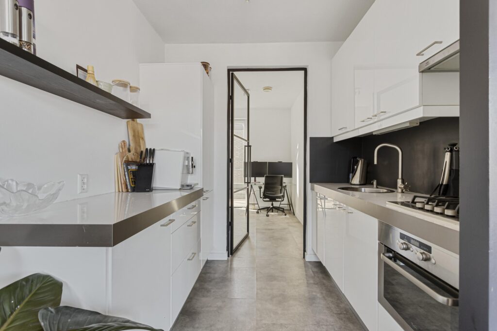 Complete keuken (ca. 2.30 x 2.10 m) in tweetal wandopstellingen uitgevoerd en voorzien van een 4-pits gasfornuis, vaatwasser (2018), koel/vries-combinatie, combi-oven/magnetron (2018) en diverse (op)bergkasten/lades. Vanuit de keuken is een doorloop naar de achtergelegen slaapkamer.