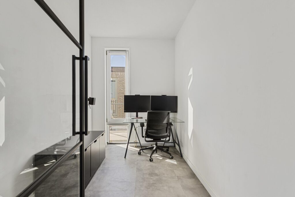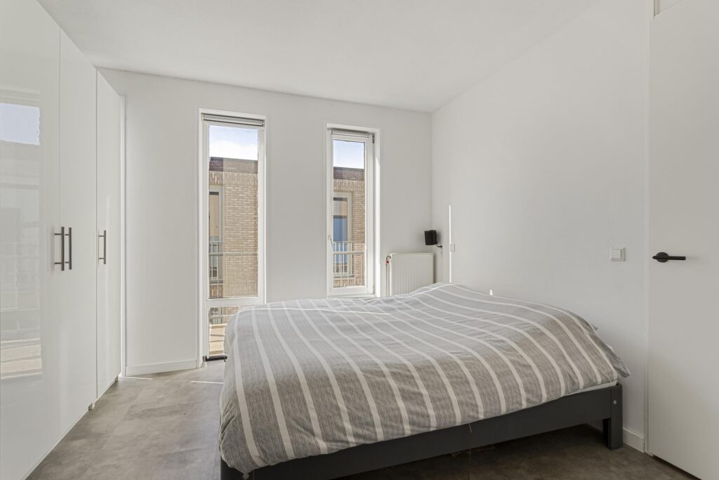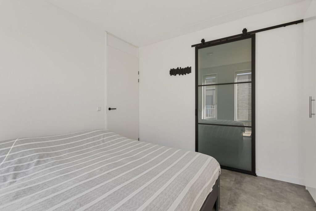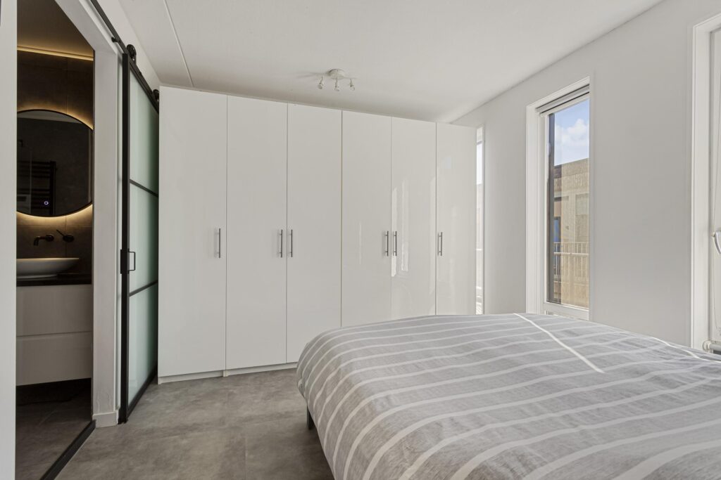 (ouder) slaapkamer I (ca. 3.73 x 3.19m) met badkamer en-suite (afsluitbaar middels een mooie schuifdeur), gelegen aan de galerijzijde en voorzien van een pvc vloer en drietal hardhouten kozijnen met isolerende beglazing wat zorgt voor voldoende daglichttoetreding; slaapkamer II (ca. 3.19 x 2.04m.) bevindt zich eveneens aan de galerijzijde met hardhouten kozijn met isolerende beglazing en pvc-vloer. Deze kamer wordt thans gebruikt als kantoorkamer en is bereikbaar vanuit de keuken.