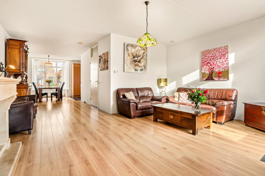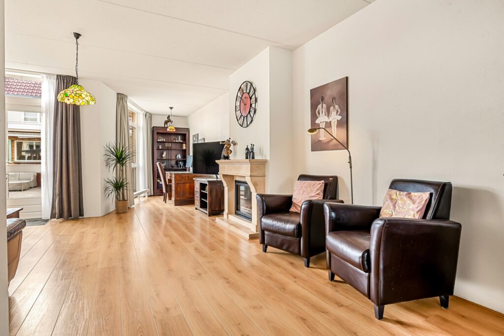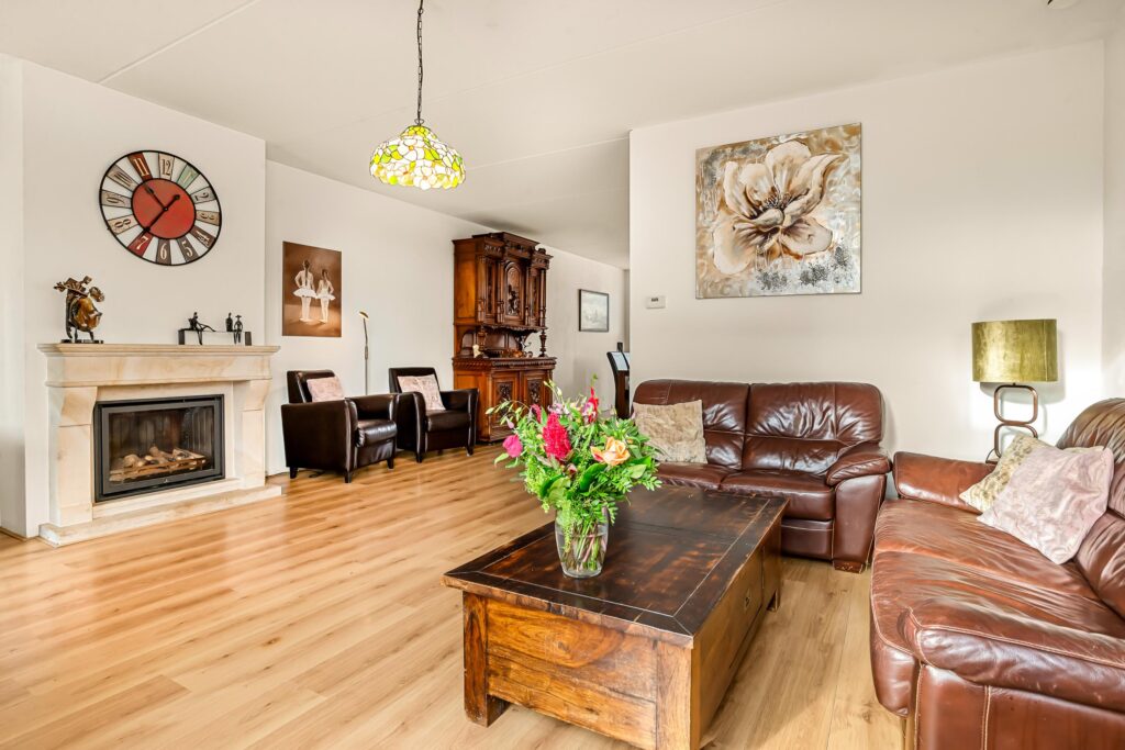 De entree bevindt zich aan de zijkant van de woning en leidt u via de ruime hal naar de lichte en sfeervolle woonkamer. Aan de achterzijde heeft u vanuit het zitgedeelte een prachtig uitzicht op de tuin. Via de openslaande deuren loopt de tuin als het ware over in de woonkamer, waardoor binnen en buiten één geheel vormen. In de wintermaanden zorgt de gezellige gashaard voor extra warmte en sfeer, terwijl de kleine uitbouw aan de tuinzijde een perfecte plek is om in alle rust een boek te lezen of om prettig thuis te werken.