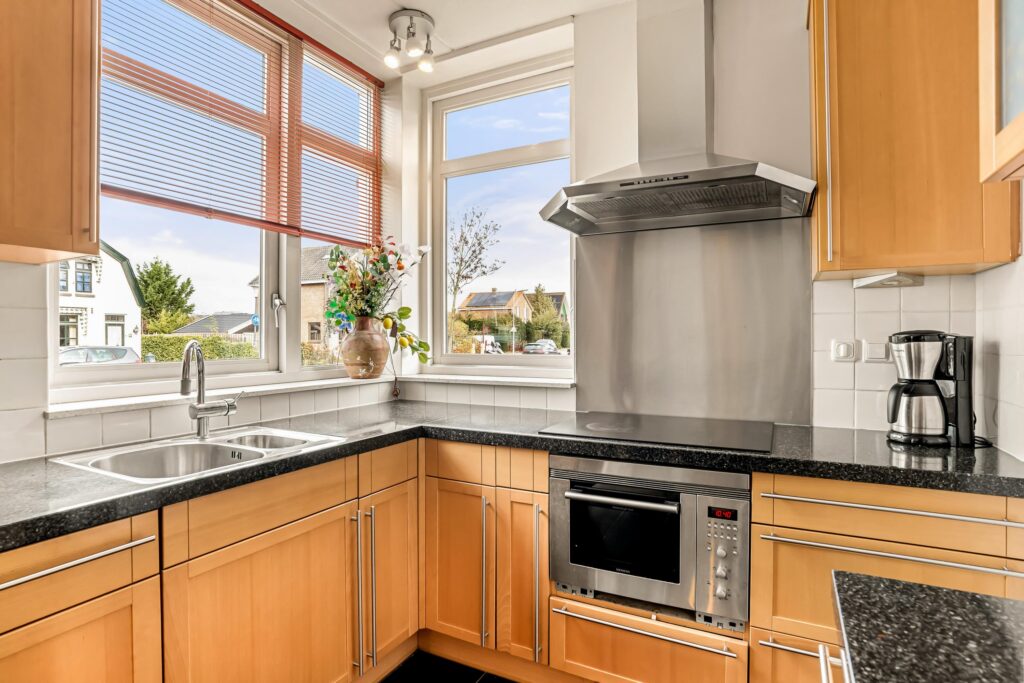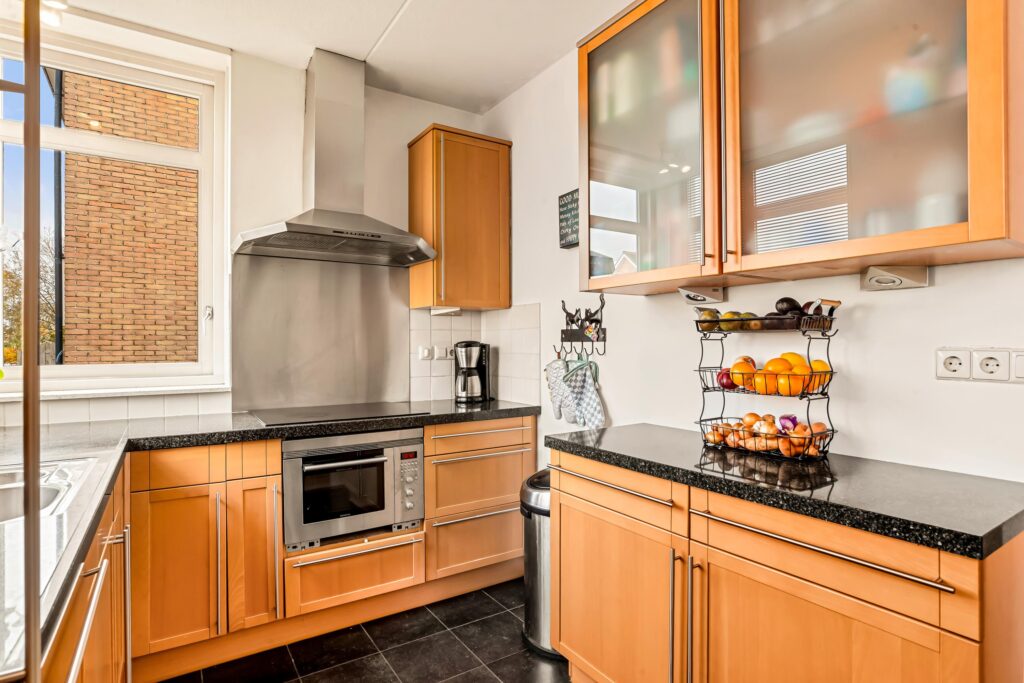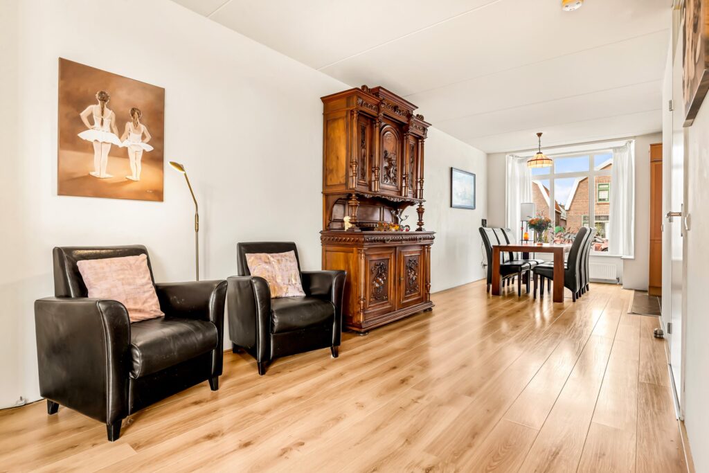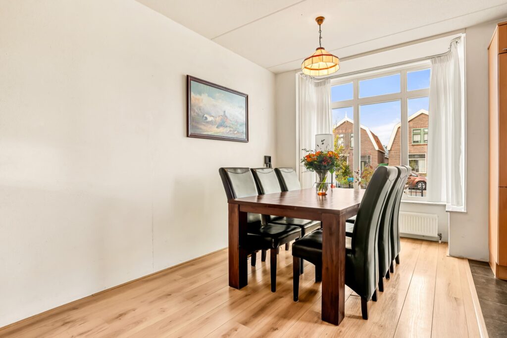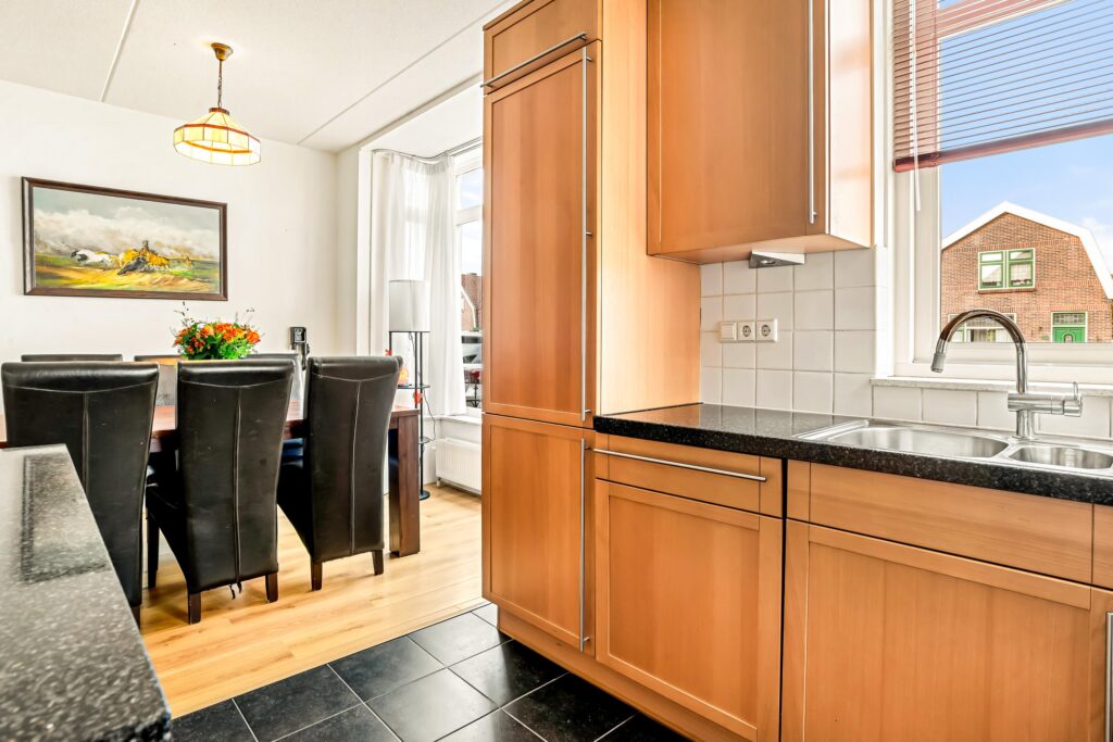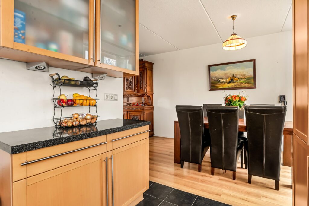 Aan de voorzijde vindt u de open keuken in U-opstelling, voorzien van diverse inbouwapparatuur en veel werk- en kastruimte. Dankzij de grote raampartij geniet u hier van levendig uitzicht op de Dorpsstraat, terwijl het eetgedeelte zorgt voor een fijne verbinding met het gezin of gasten tijdens het koken.