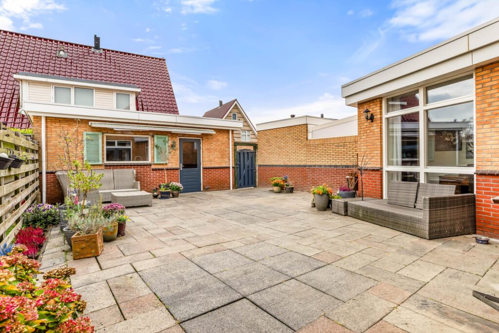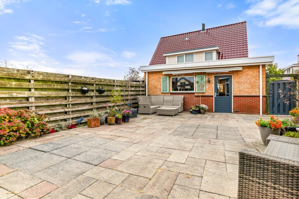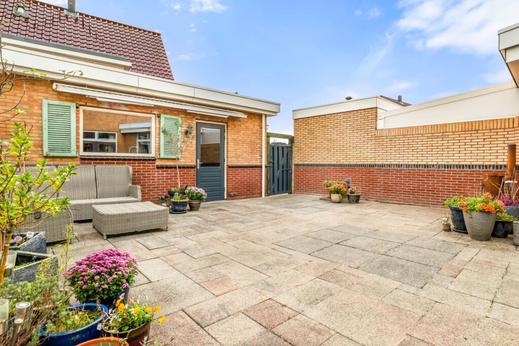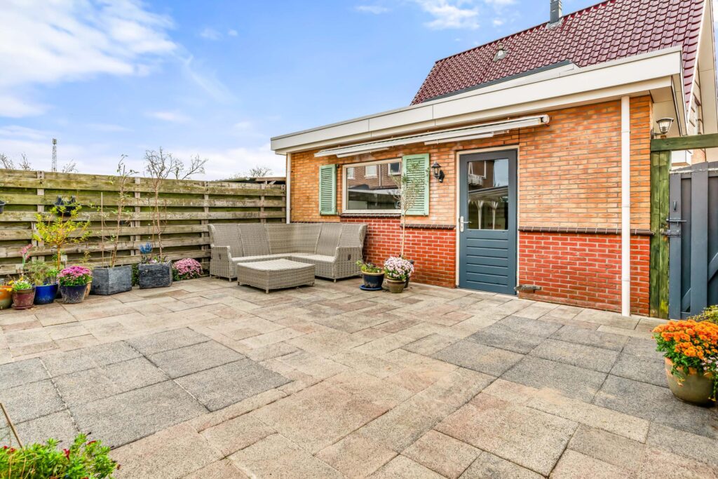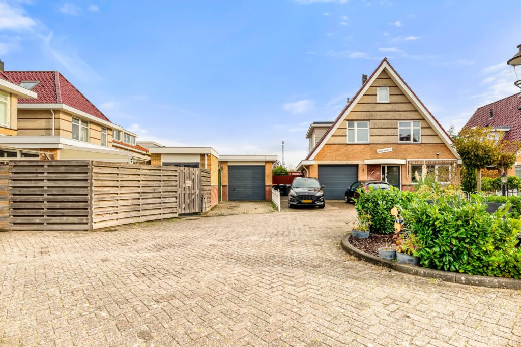 De zonnige achtertuin op het zuidoosten is een heerlijke plek om te ontspannen, met volop ruimte om te loungen, te dineren of gewoon van de zon te genieten. Aan de zijkant van de woning is een overkapping gerealiseerd. Achterin de tuin staat de ruime, vrijstaande stenen garage met elektrische deur, welke via het met enkel de naaste buren gedeelde plein te bereiken is. Op de eigen oprit is bovendien plek voor drie auto’s – parkeren is hier dus geen enkel probleem.
