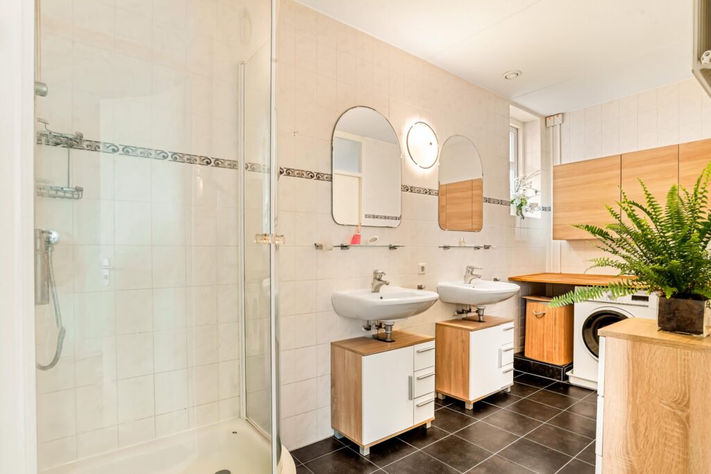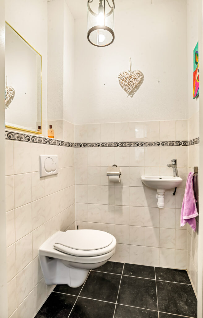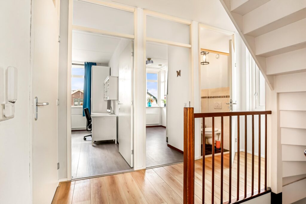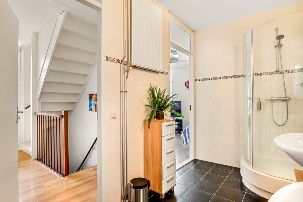 Op de eerste verdieping bevinden zich drie slaapkamers, waaronder een royale ouderslaapkamer aan de achterzijde. De centraal gelegen badkamer is praktisch én voorzien van een douchehoek, dubbele wastafel met meubel en een handige wasopstelling met werkblad. Dankzij de twee toegangsdeuren is de badkamer voor iedereen goed bereikbaar. Daarnaast is er op deze verdieping een separaat toilet aanwezig.
