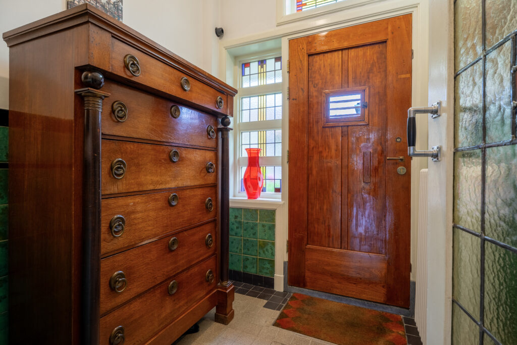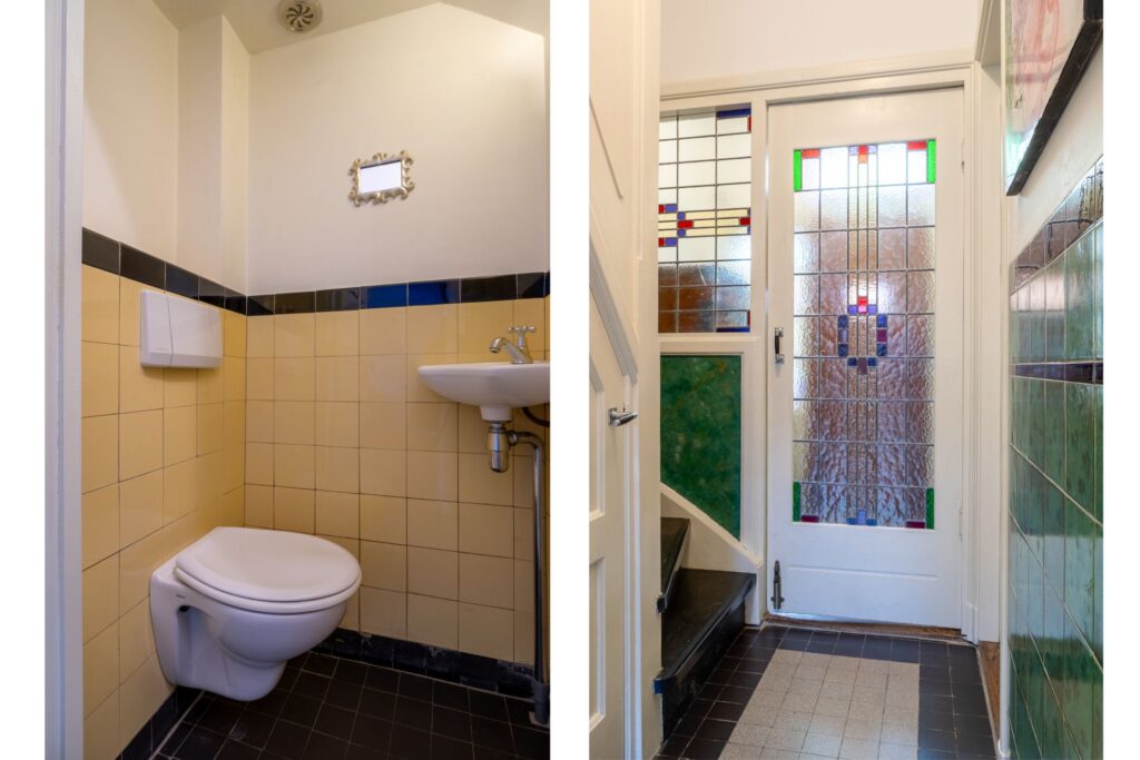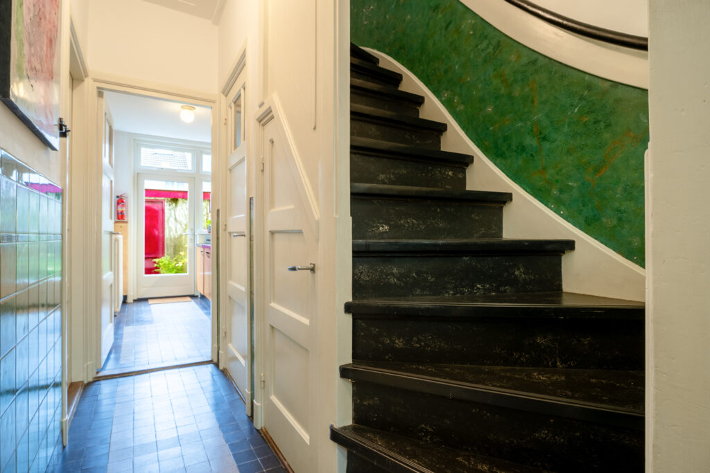 In de hal word je meteen verwelkomd door de vele originele details, zoals glas-in-lood en de lambrisering. Hier vind je de trapopgang naar de eerste verdieping, een verdiepte trapkast met meterkast, toiletruimte en is toegang mogelijk naar de woonkamer en de keuken.