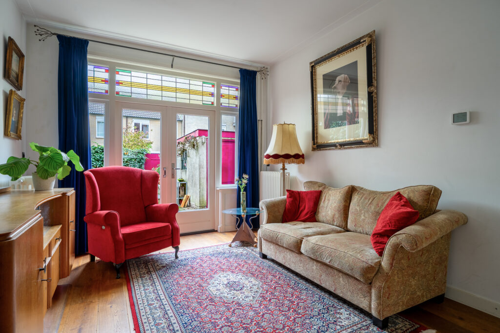 Sfeervolle woonkamer en suite (ca. 9.28 x 3.35m.) met houten vloer, strakke wand- en plafondafwerking met sierlijsten en erker met hardhouten kozijn en glas in lood aan de voorzijde. Aan de achterzijde is direct tuincontact mogelijk middels de openslaande tuindeuren. De prachtige en-suite deuren scheiden de woonkamer mooi in een woon/-eetgedeelte en bieden daarnaast enorm veel praktische bergruimte in de kasten.