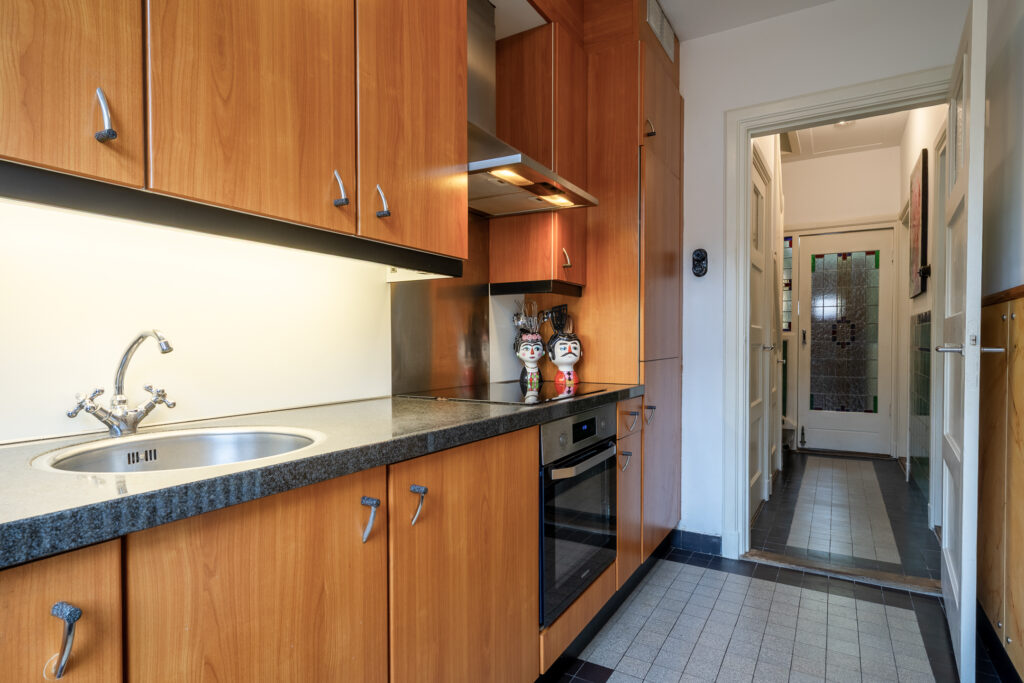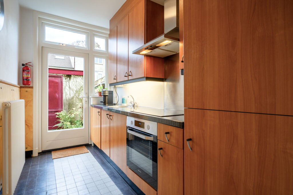 Complete keuken (ca. 3.40 x 1.79m.) in wandopstelling en gelegen aan de achterzijde. De keuken is uitgerust met o.a. een inductiekookplaat (2 pits en flexibele zone), oven, vriezer, koelkast, spoelbak en diverse (op) bergkasten. Vanuit de keuken is middels een toegangsdeur de tuin te bereiken.