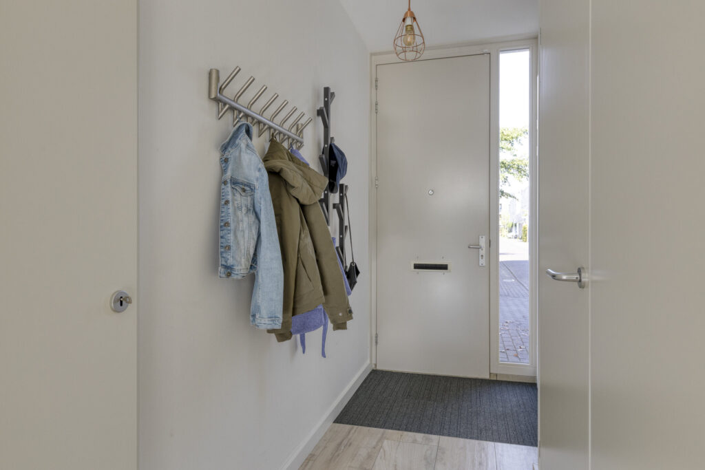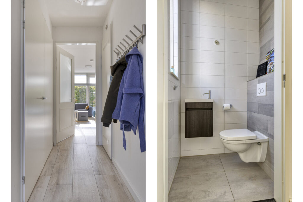Entree met toilet, meterkast en een praktische berging met opstelling van de warmtepomp.