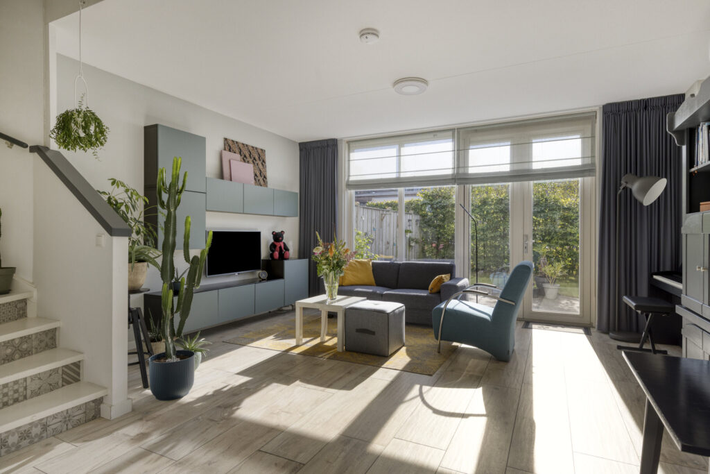 Ruime en lichte woonkamer dankzij de grote glazen pui met openslaande deuren naar de tuin.