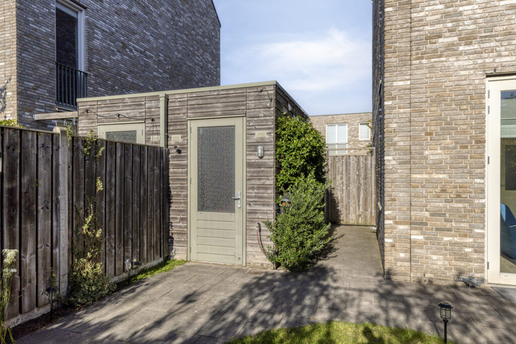 Een zonnige, privacy-rijke achtertuin op het zuidwesten, met terras, gazon, volwassen beplanting en een separate berging met overkapping. Dankzij de vrije ligging geniet je volop van rust, zon en privacy. De tuin is te bereiken via een achterom bij de eigen oprit.