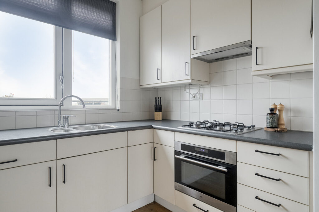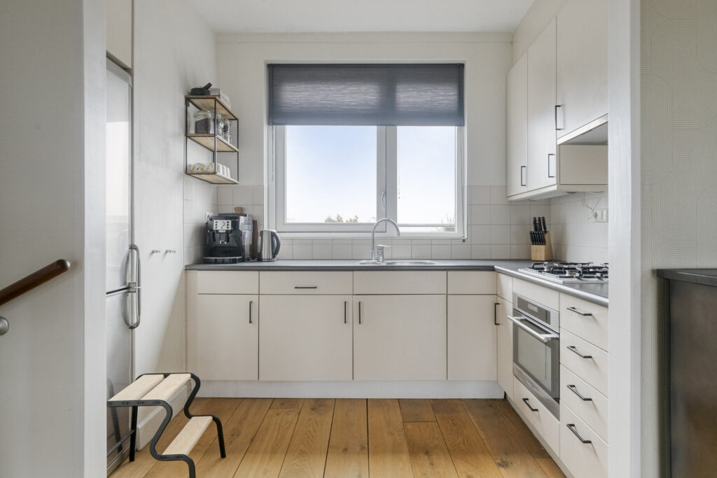 De open keuken is geplaatst in een hoekopstelling met extra nis voor een koel-vriescombinatie en bovenkastje voor extra opbergruimte. De keuken is compleet uitgerust met de volgende inbouwapparatuur: een 4-pits gaskookplaat met afzuigkap, vaatwasser en combi-oven (2023). Het raam zorgt voor de mogelijkheid tot natuurlijke ventilatie en geeft een fraai uitzicht naar buiten.