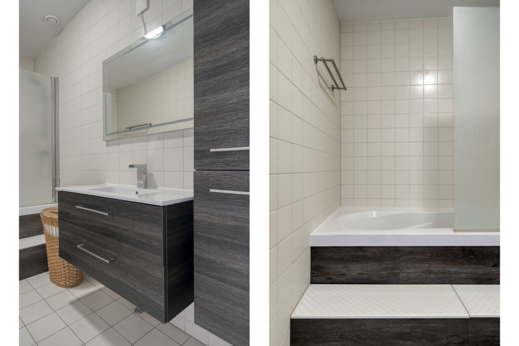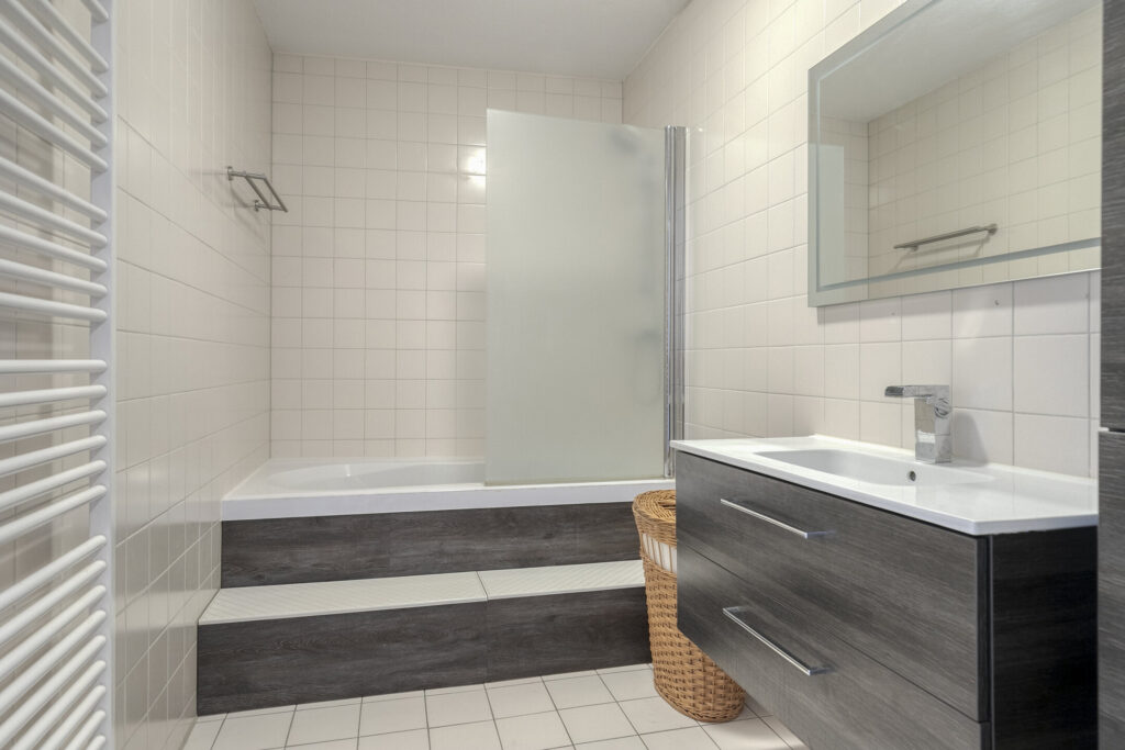 De complete badkamer is ingericht met een ligbad-/douchecombinatie met glazen scherm, wastafelmeubel en designradiator. Alle wanden zijn volledig betegeld met een lichte tegel. Door het wastafelmeubel in houtlook en de afwerking van het bad in hetzelfde materiaal, krijgt de ruimte sfeer en warmte.
