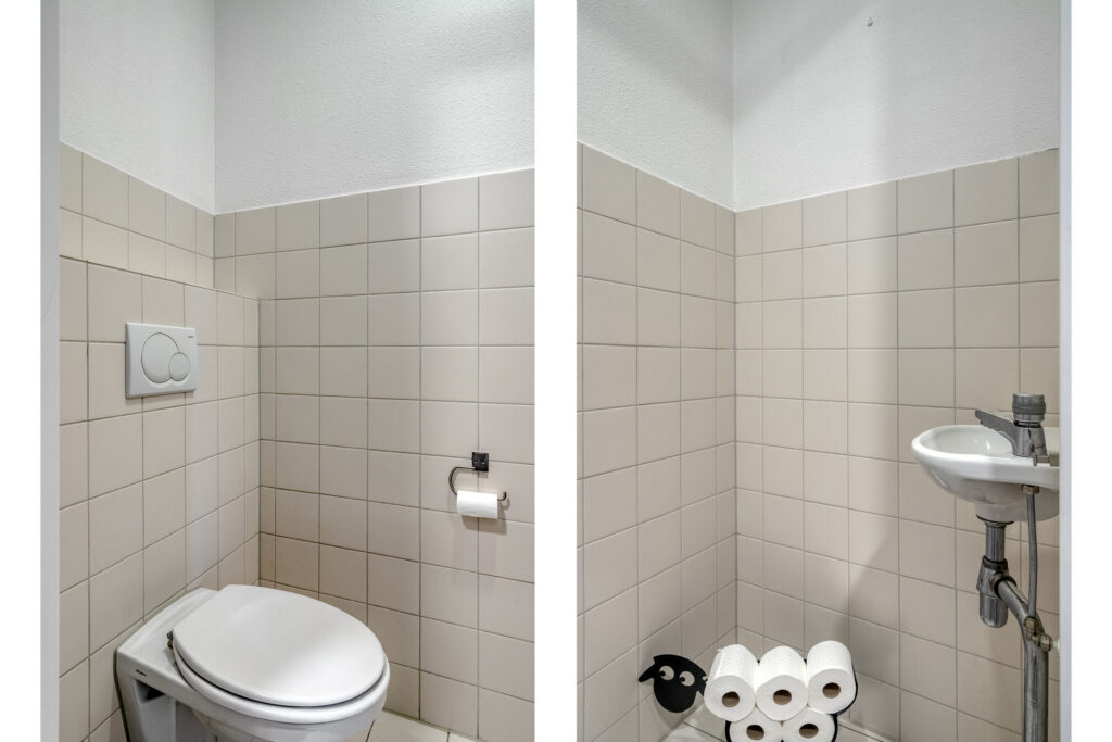 De separate toiletruimte is voorzien van een wandcloset en fonteintje. De wanden zijn deels betegeld in een neutrale kleurstelling.