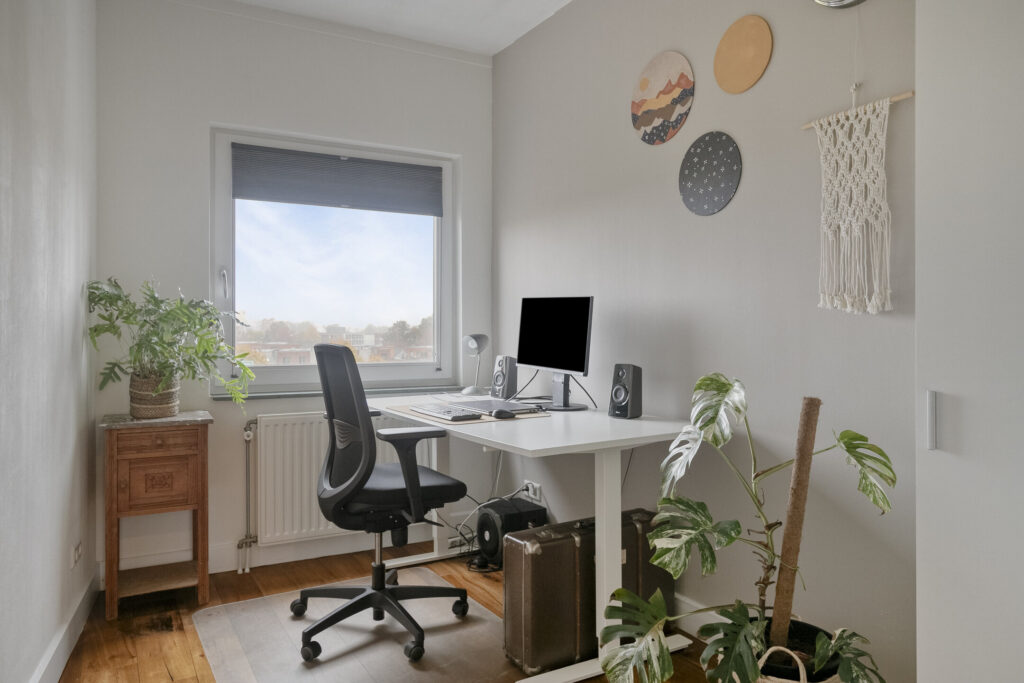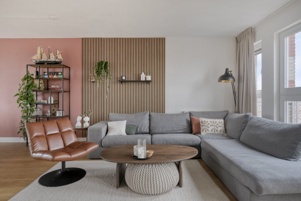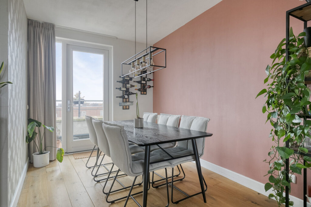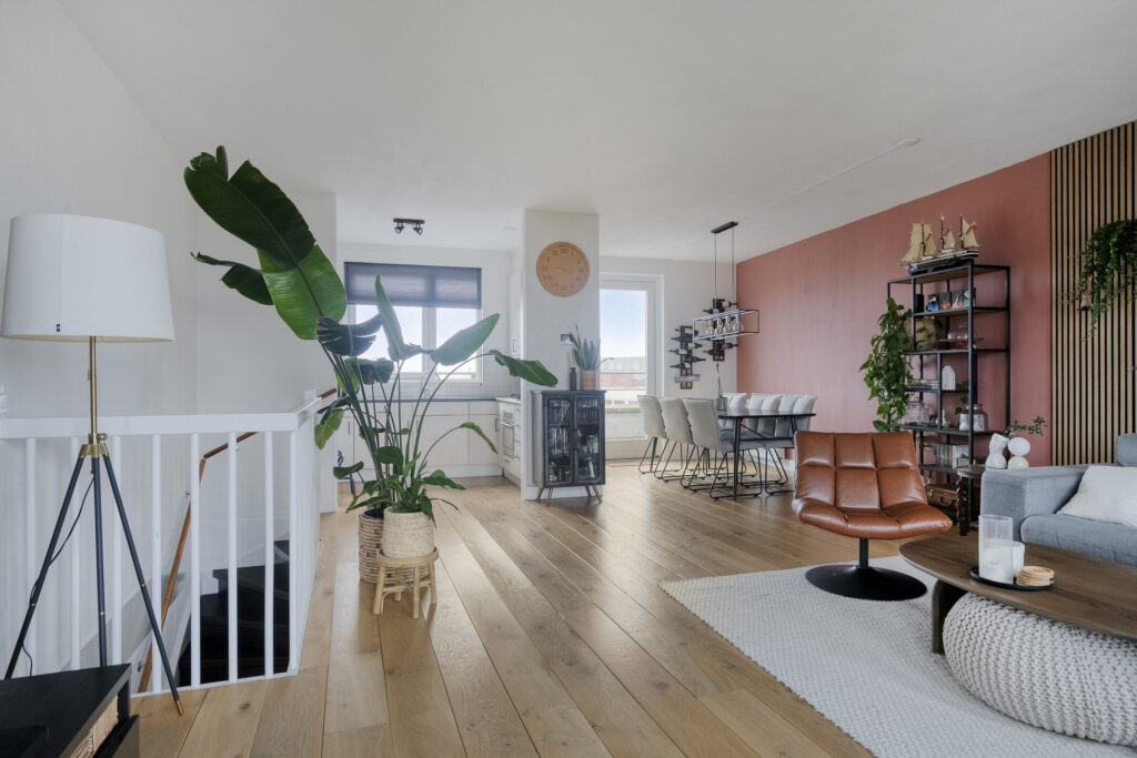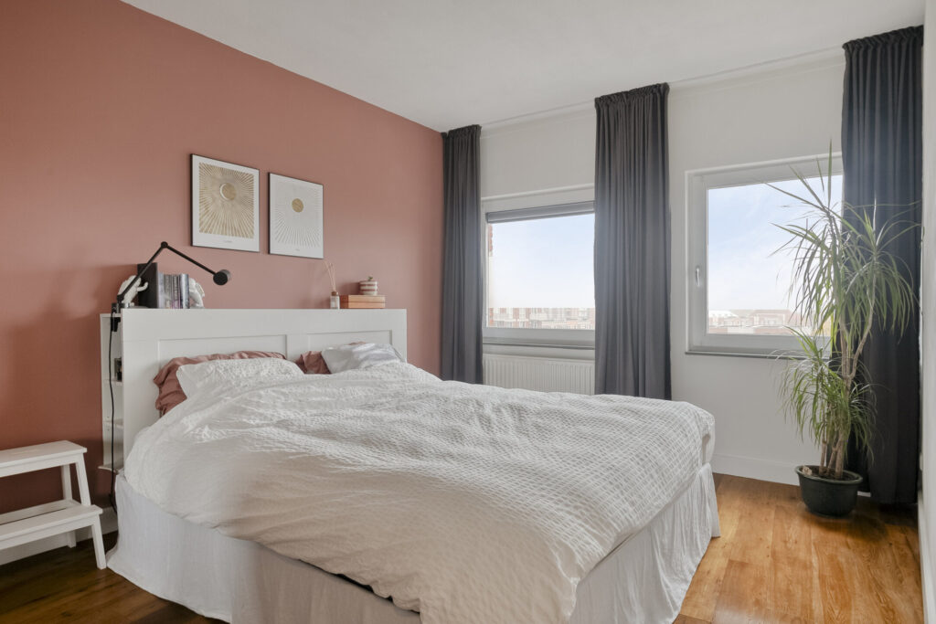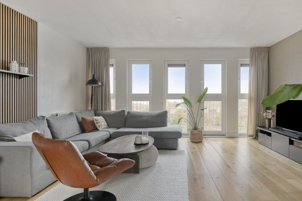 Blikvanger hier zijn toch wel de hoge raampartijen die een panoramisch uitzicht geven over de stad. Door de grote raampartijen aan zowel voor- als achterzijde, geniet de ruimte volop daglicht. De ruimte is niet alleen licht maar ook enorm sfeervol door de gekozen kleuren op de wand het houten wandpaneel. Echt een hele fijne ruimte om heerlijk te vertoeven!