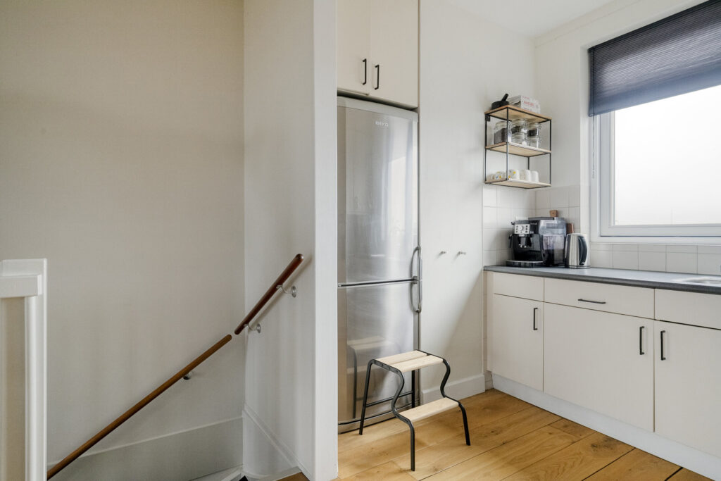 Ook deze woonlaag is voorzien van een houten vloer. Alle wanden en het plafond zijn gestuukt.