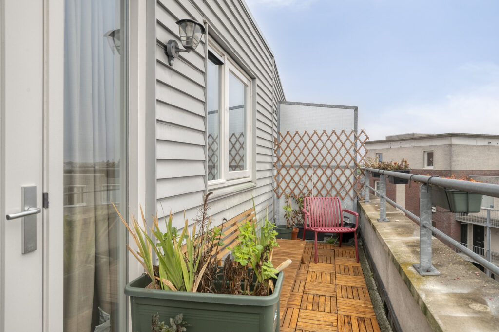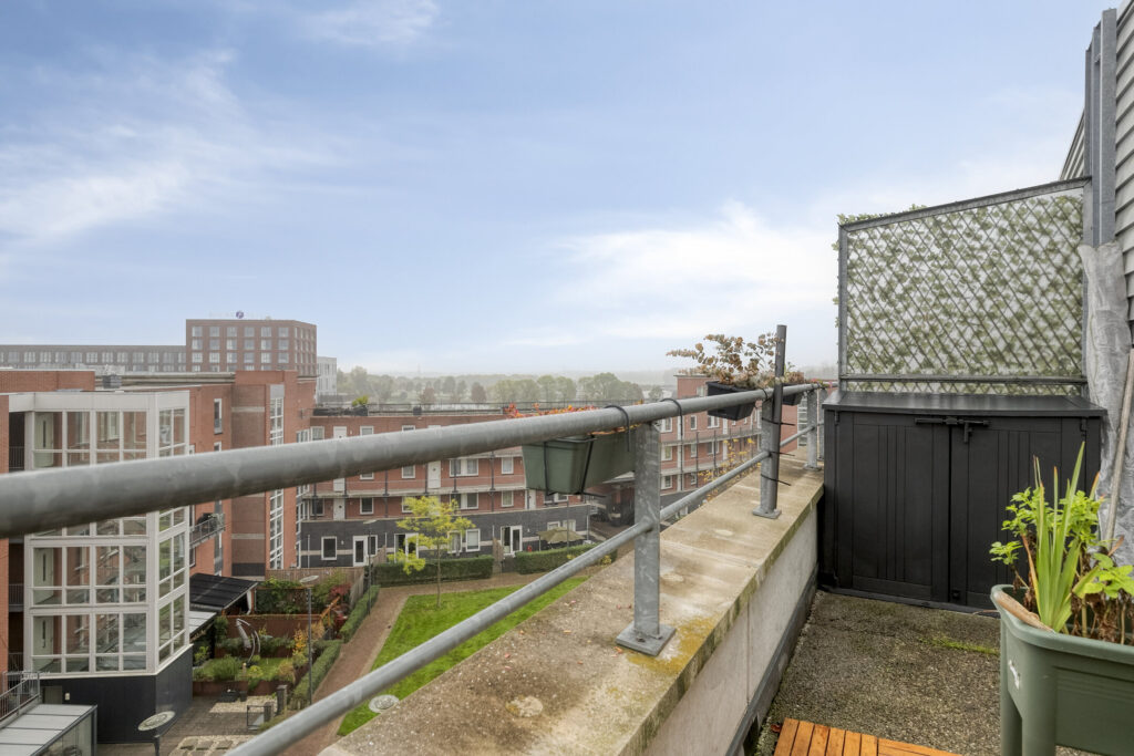 Aan de achterzijde, bereikbaar via het eetgedeelte, bevindt zich het ruime balkon met uitzicht over de groene binnentuin. Hier is het heerlijk vertoeven. Door de ligging een perfecte plek voor een ontbijt of lunch in het zonnetje.