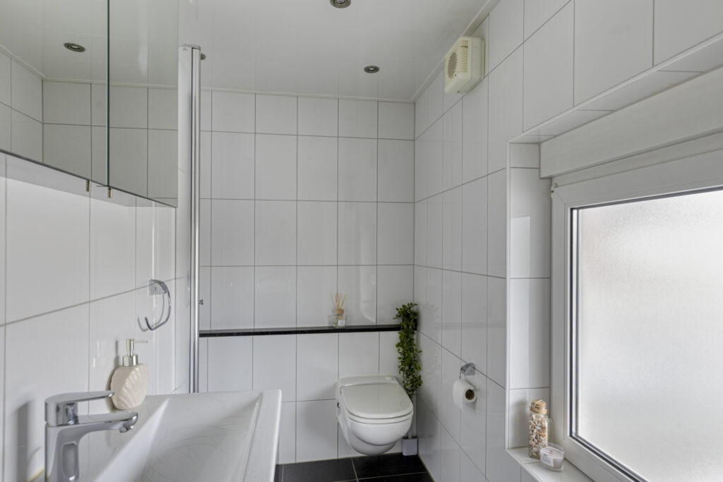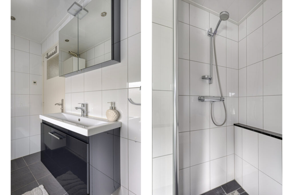 Compact maar compleet: inloopdouche met thermostaatkraan, wastafelmeubel met spiegelkast en toilet (sanibroyeur). Ventilatie kan zowel natuurlijk (raam) als mechanisch, tevens beschikt de badkamer over elektrische vloerverwarming.