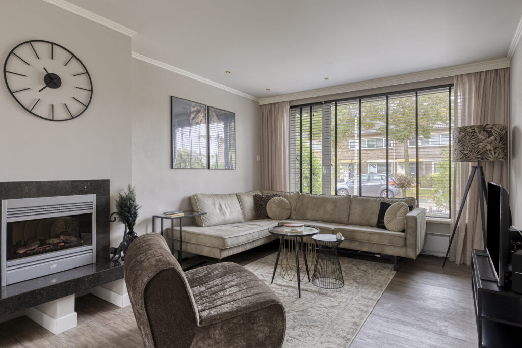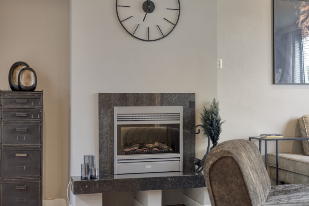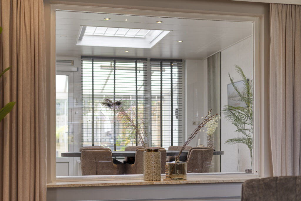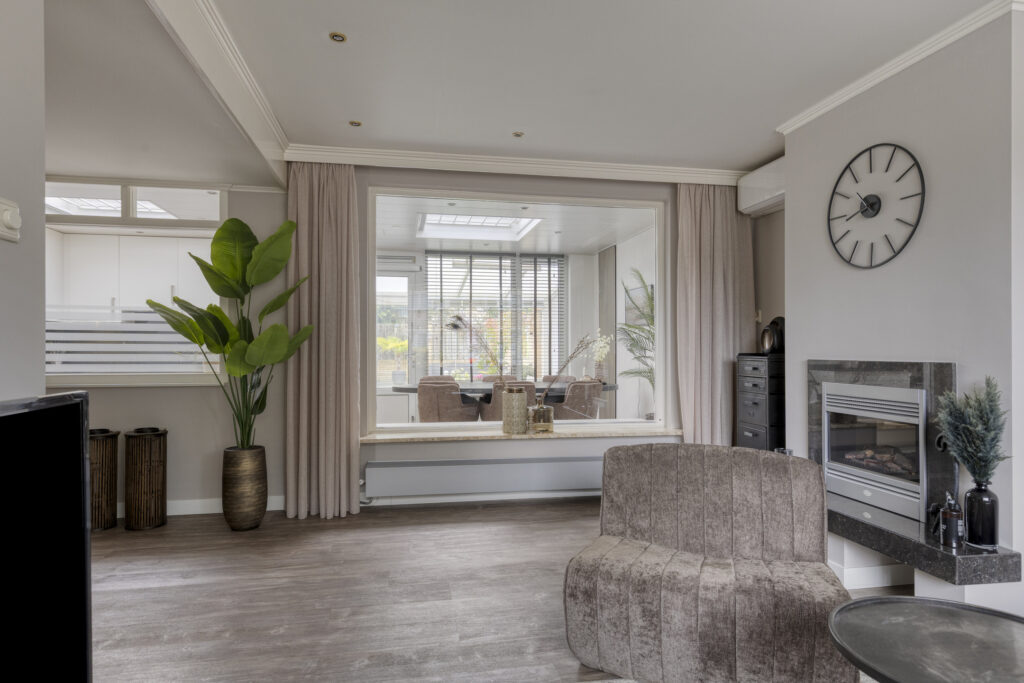 De L-vormige living is licht en ruim dankzij de grote raampartijen (met zonnescreen aan de voorzijde). De afwerking is strak met gestucte wanden, PVC-vloer en een spanplafond met inbouwspots. Een elektrische haard brengt extra sfeer in de donkere maanden. De airco-unit zorgt het hele jaar door voor een prettig binnenklimaat.