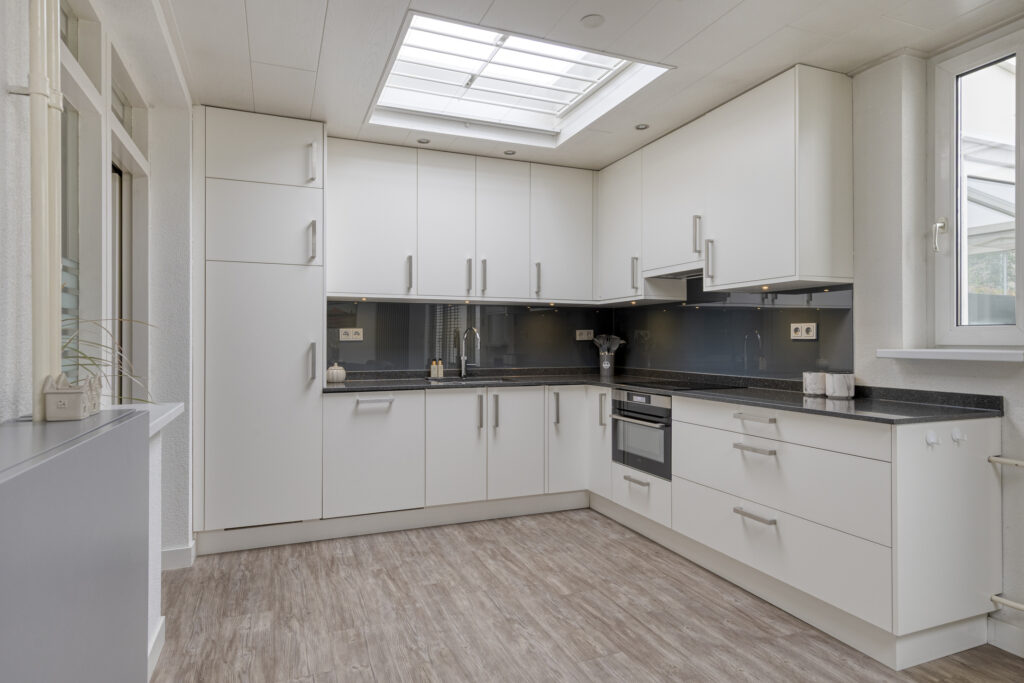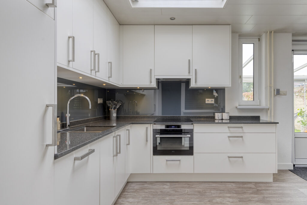 De keuken is compleet uitgerust met een granieten werkblad, inductiekookplaat, afzuigkap, vaatwasser, koelkast, combi-oven en Quooker voor direct kokend water. Veel kasten en lades bieden ruim voldoende bergruimte.