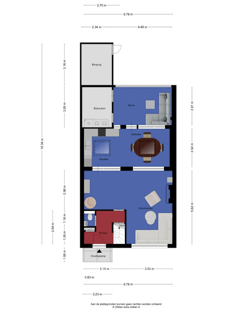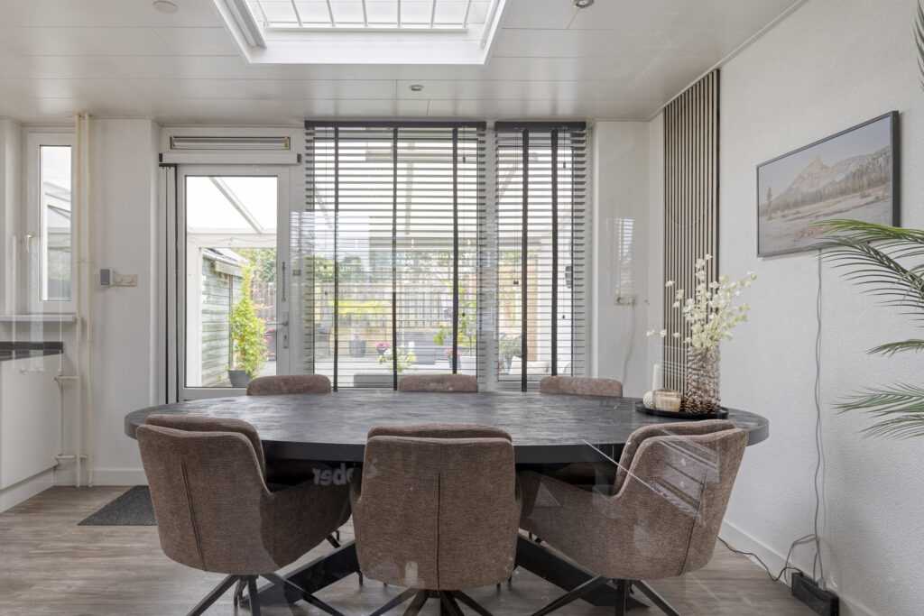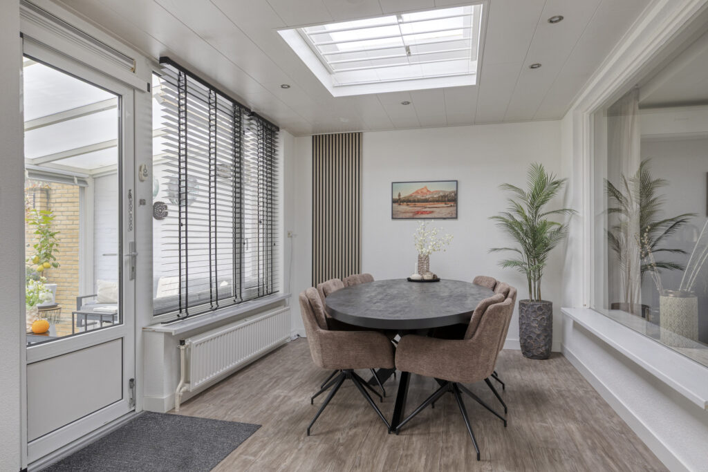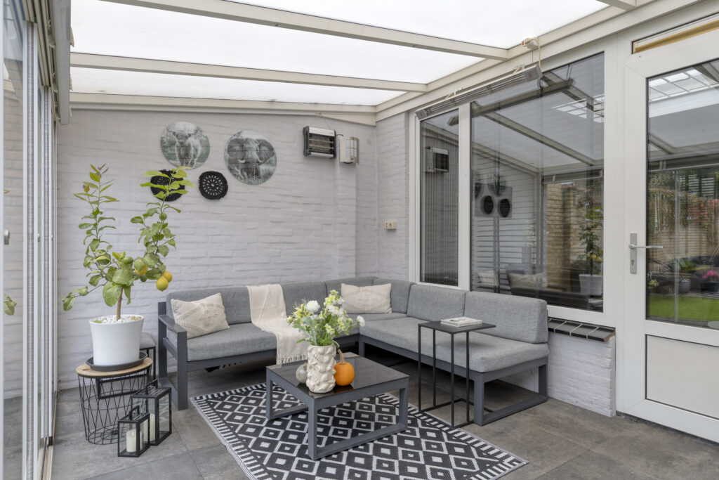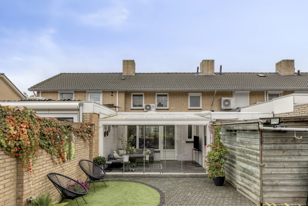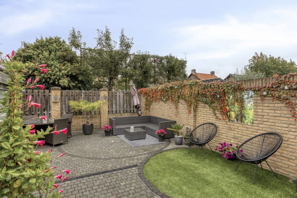 De achtertuin is onderhoudsvriendelijk en biedt veel privacy. Ingericht met terras, kunstgras, houten berging en achterom. Via de serre sta je in een paar stappen buiten, ideaal voor wie graag binnen en buiten laat samenkomen.
