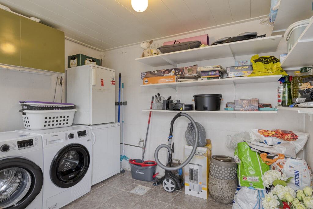 Achter de keuken bevindt zich de aluminium serre/tuinkamer met verlichting, verwarming en een glazen schuifwand naar de tuin; zo verleng je het buitenseizoen moeiteloos. Aansluitend ligt de wasruimte met aansluitingen voor wasapparatuur.