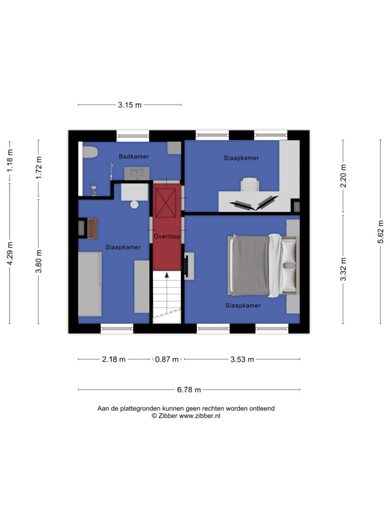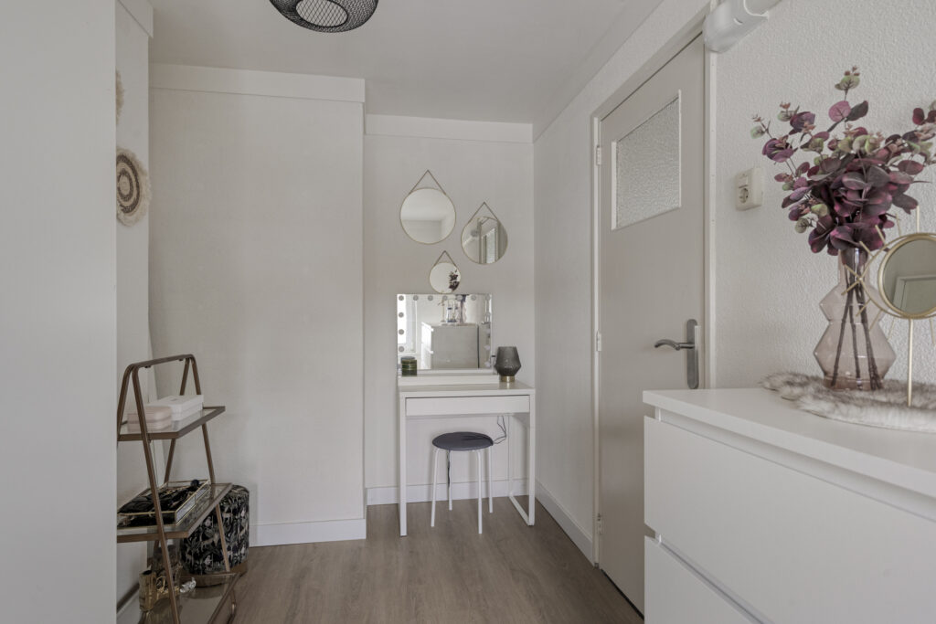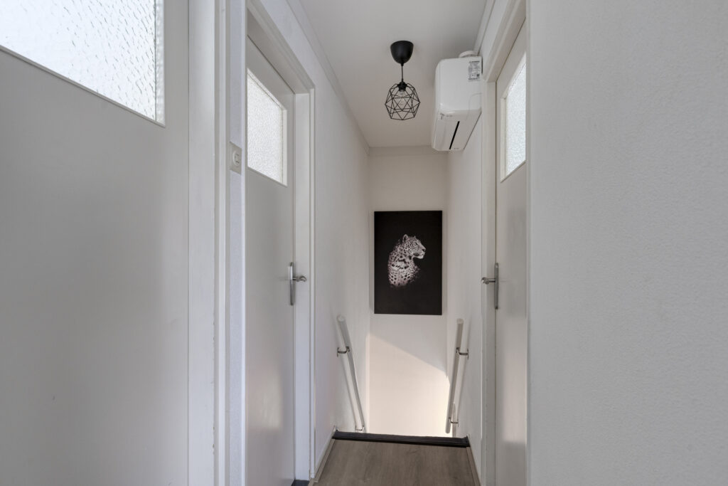 De overloop met PVC-vloer geeft toegang tot drie slaapkamers en de badkamer. De airco-unit op de overloop kan de gehele verdieping koelen of (bij)verwarmen.