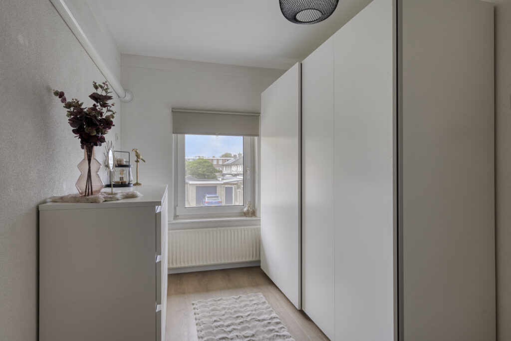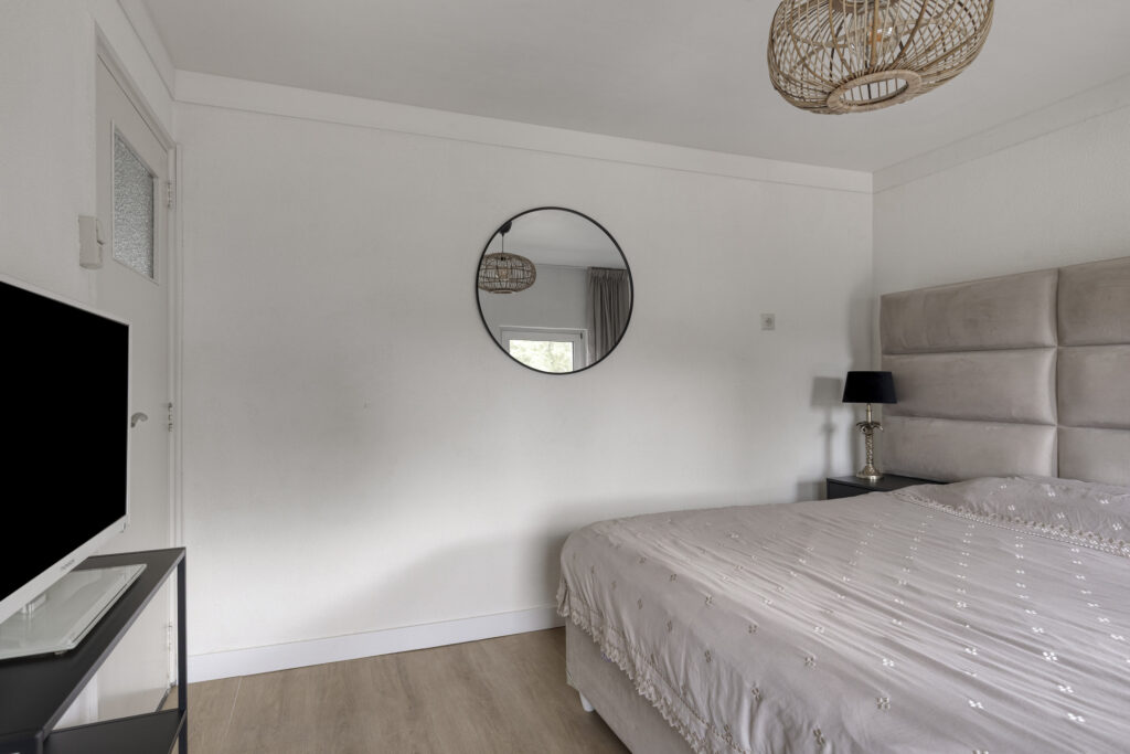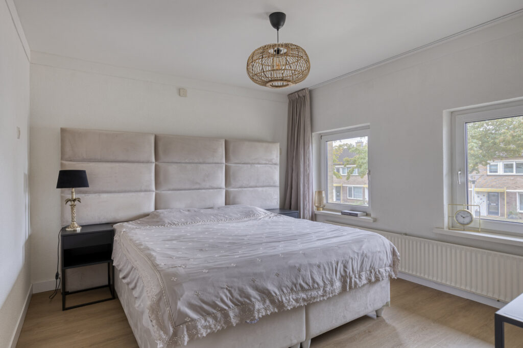 Slaapkamer 1 (voorzijde): ruim van opzet, PVC-vloer, kunststof kozijnen met dubbele beglazing en rolluiken.