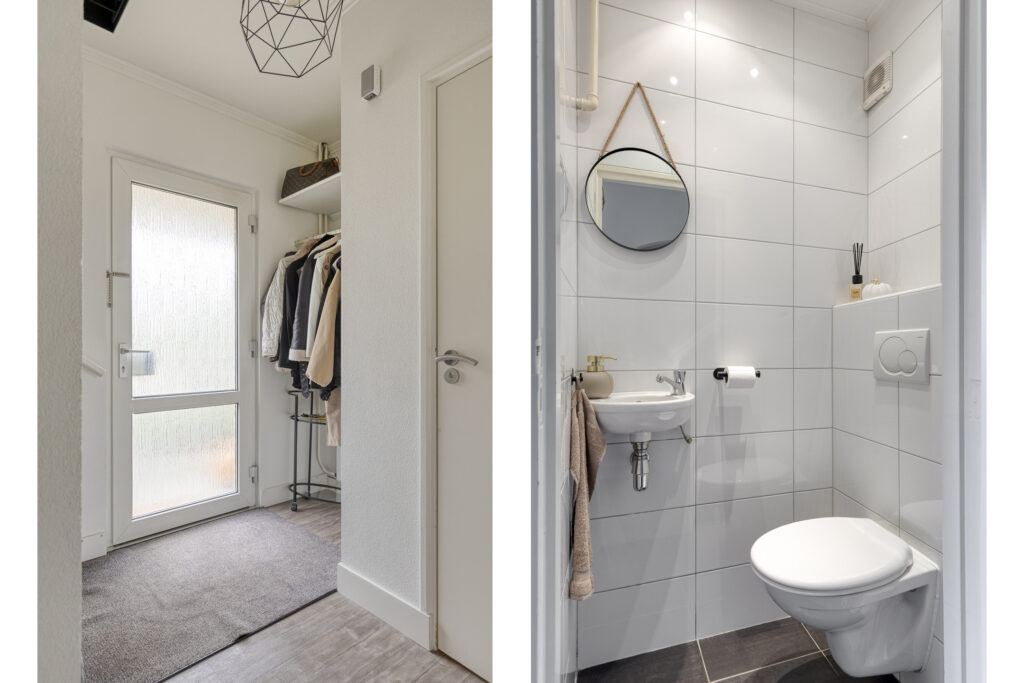 Via de verzorgde voortuin bereik je de overdekte entree. De hal met PVC-vloer biedt plaats aan garderobe, meterkast, een praktische trapkast en de toiletruimte.